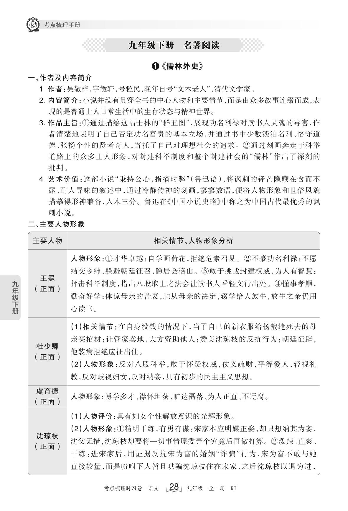 2024下册九年级语文人教版 考点梳理手册——九年级下册 名著阅读《儒林外史》(8月版)