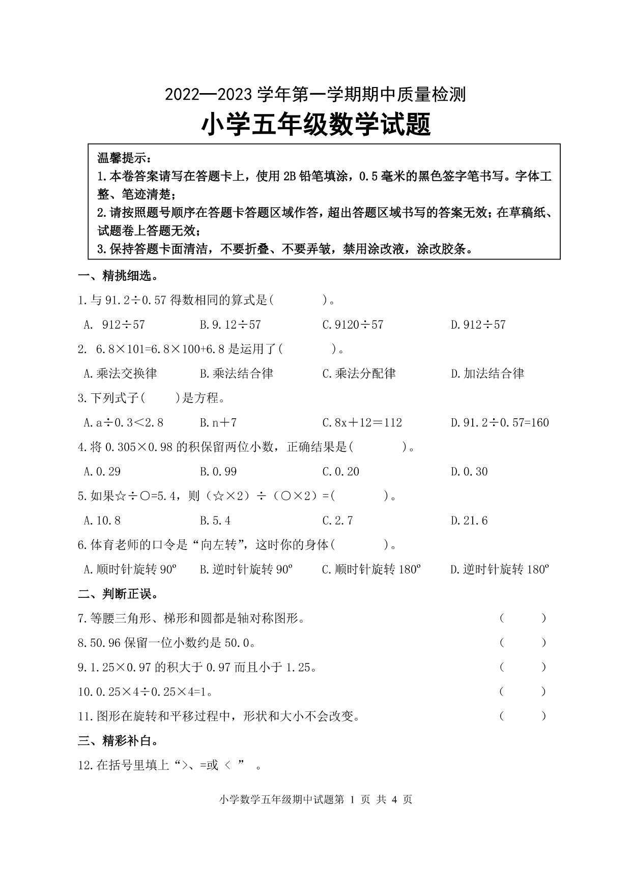 五年级数学青岛版上册期中卷