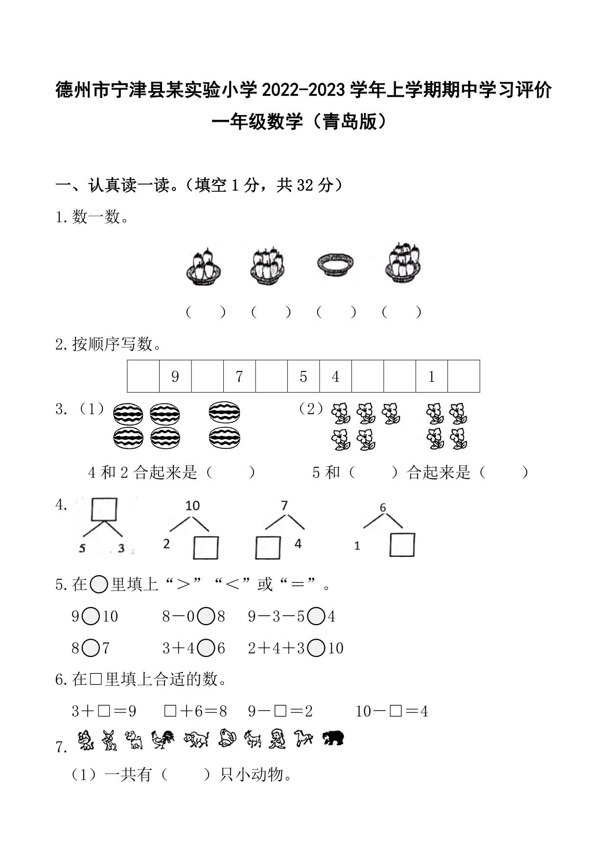 山东省德州市宁津县某实验小学2022-2023学年上学期期中学习评价试题一年级数学(青岛版)