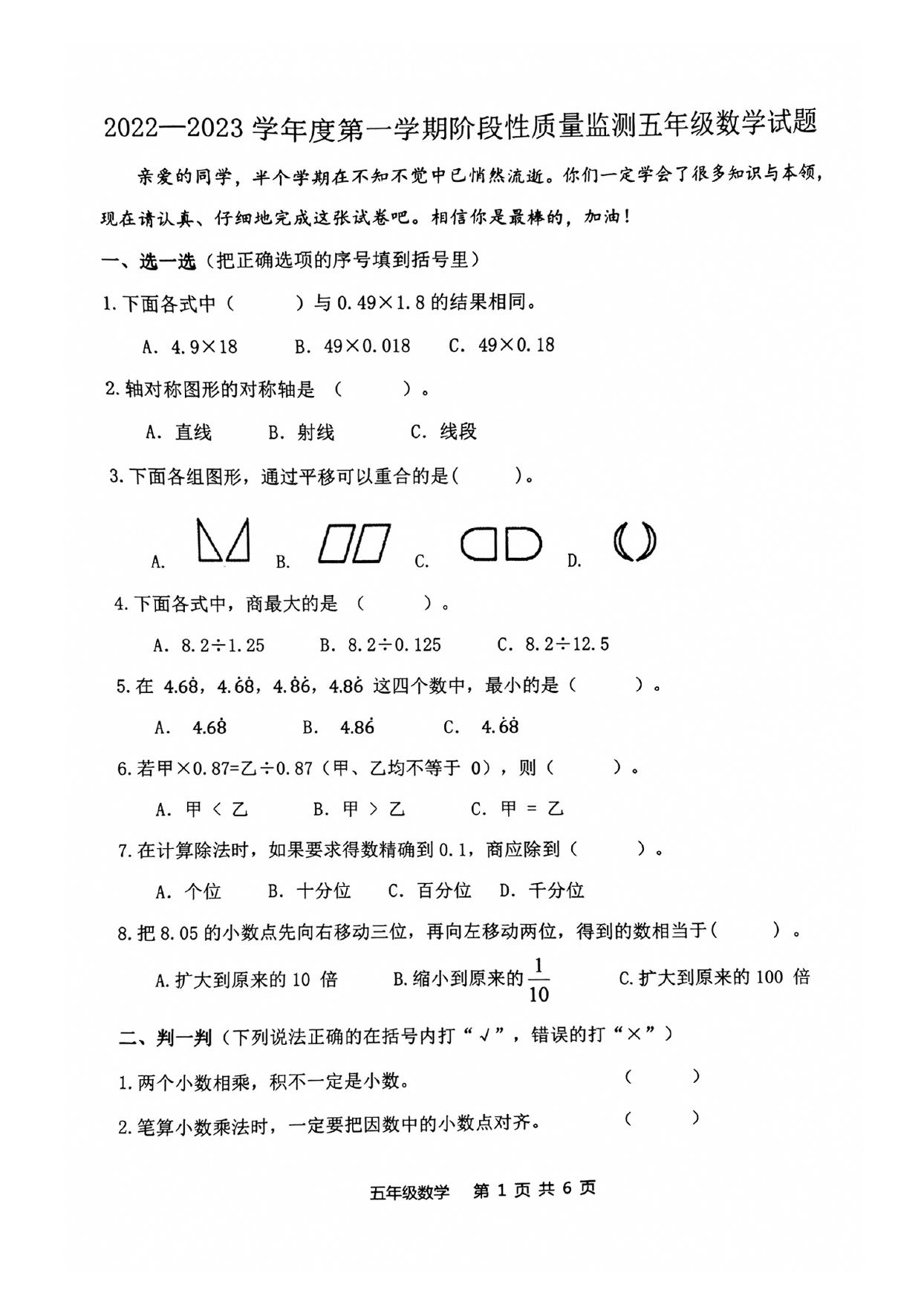 山东省滨州市阳信县2022-2023学年度第一学期期中阶段性质量监测试题五年级数学(青岛版)