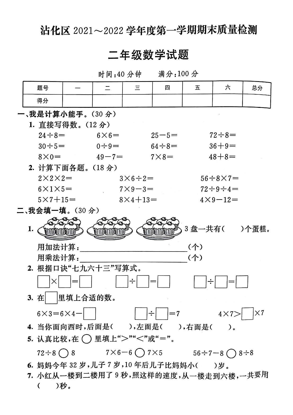 山东省滨州市沾化区2021-2022学年度第一学期期末质量检测试题二年级数学(青岛版)