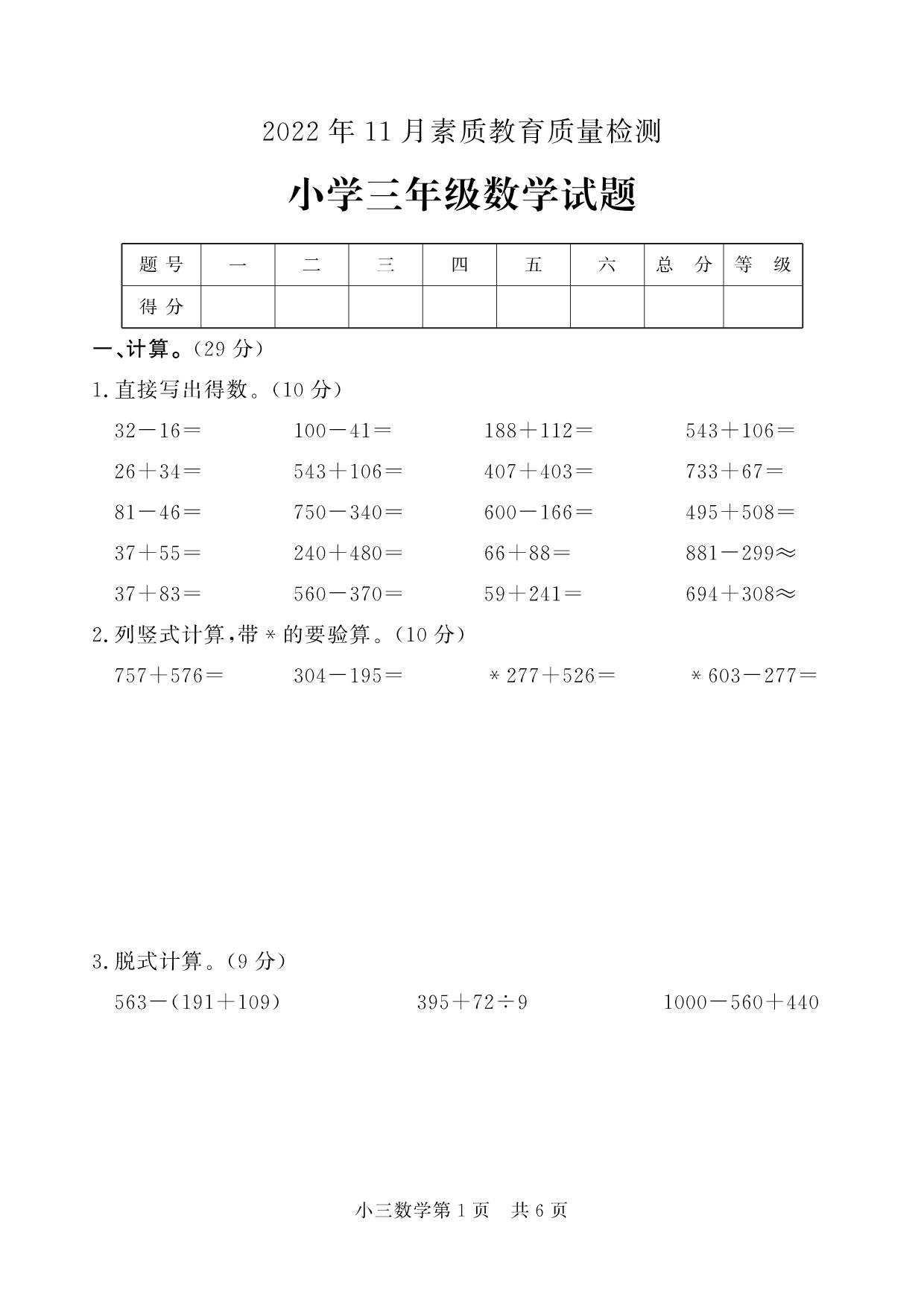 山东省菏泽市曹县2022-2023学年上学期11月素质教育质量检测期中试题三年级数学(人教版)