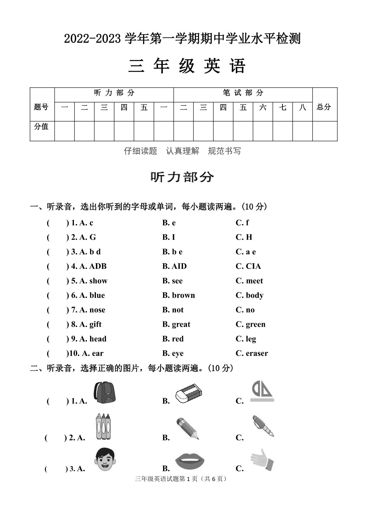 山东省滨州市无棣县2022-2023学年第一学期期中学业水平检测三年级英语(人教PEP版)【无听力音频】