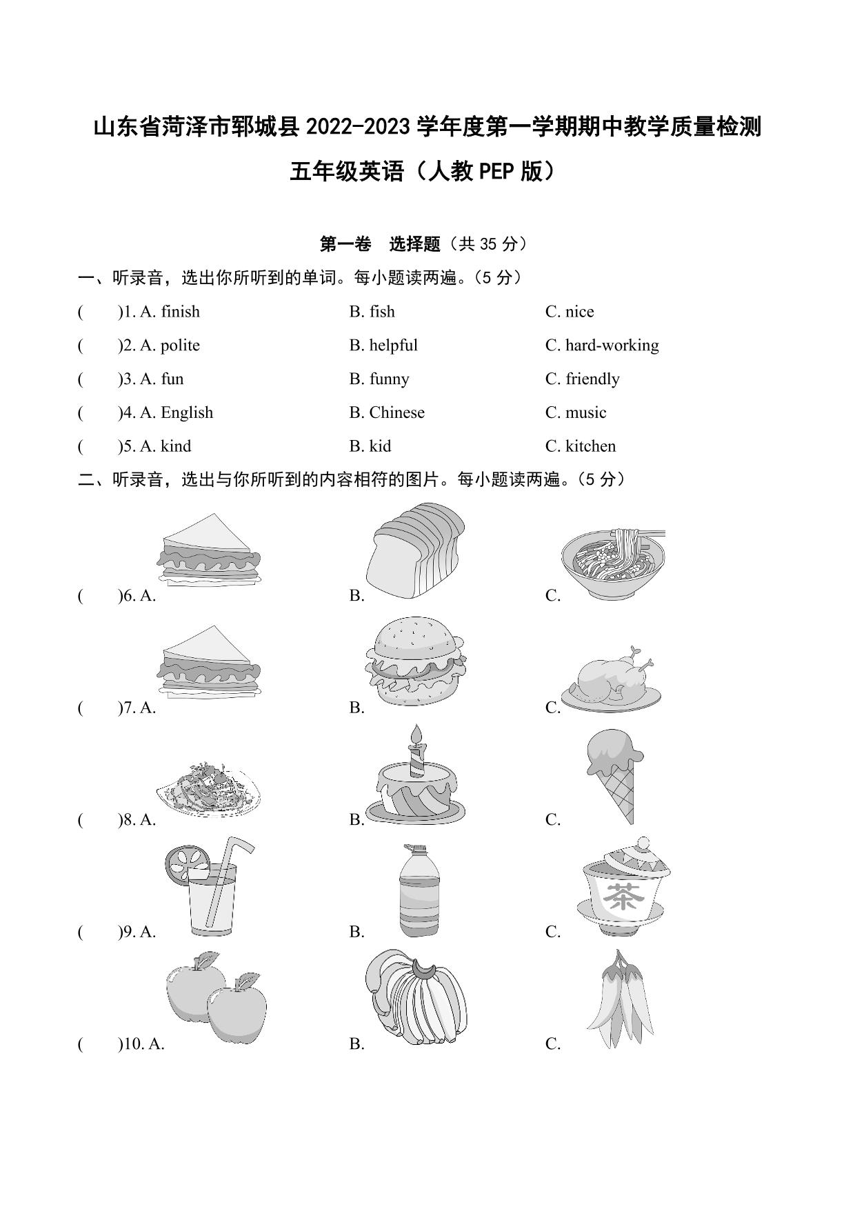 山东省菏泽市郓城县2022-2023学年度第一学期期中教学质量检测五年级英语(人教PEP版)【无听力音频】