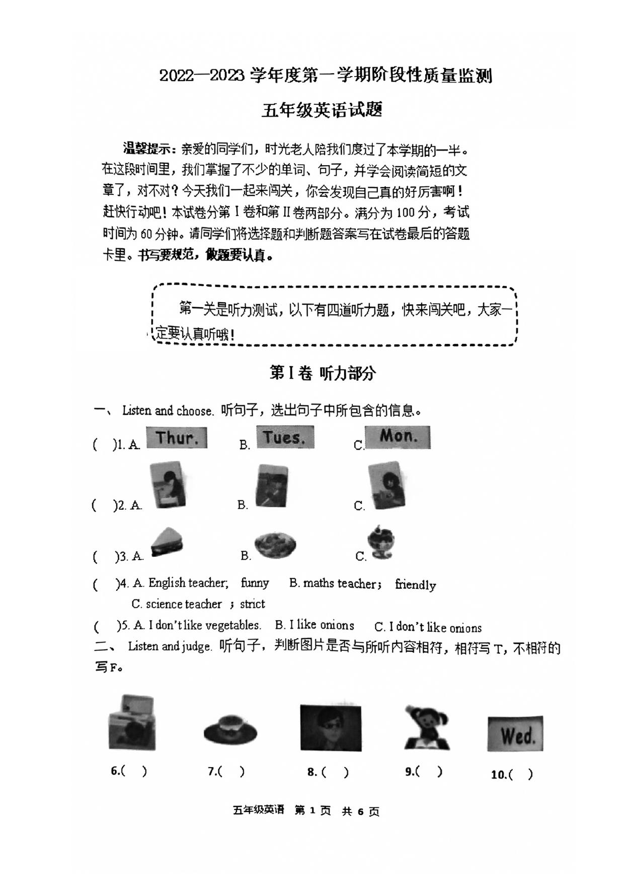 山东省滨州市阳信县2022-2023学年度第一学期期中阶段性质量监测试题五年级英语(人教PEP版)【无听力音频】