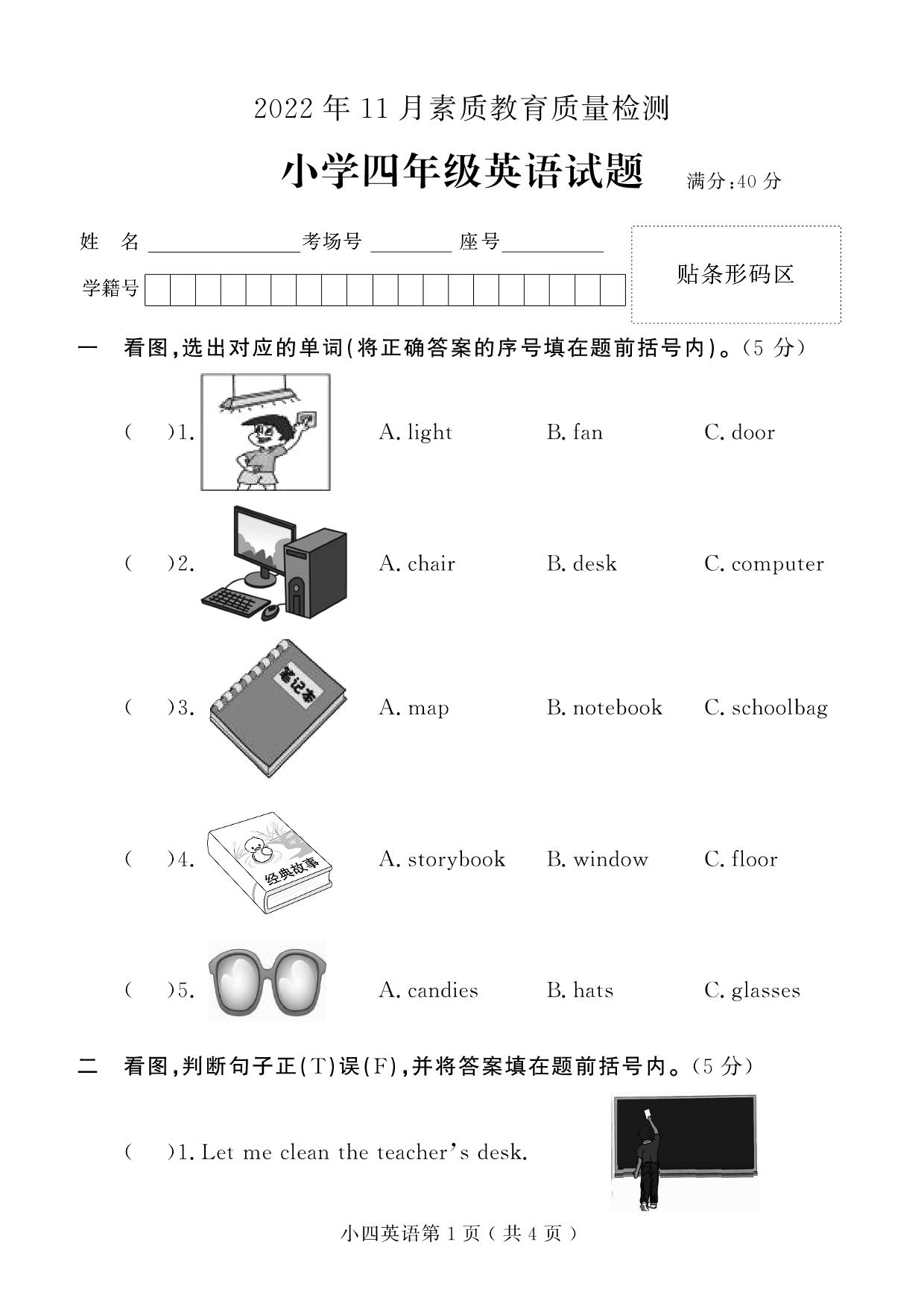 山东省菏泽市曹县2022-2023学年第一学期期中素质教育质量检测试题四年级英语(人教PEP版)【无听力音频】