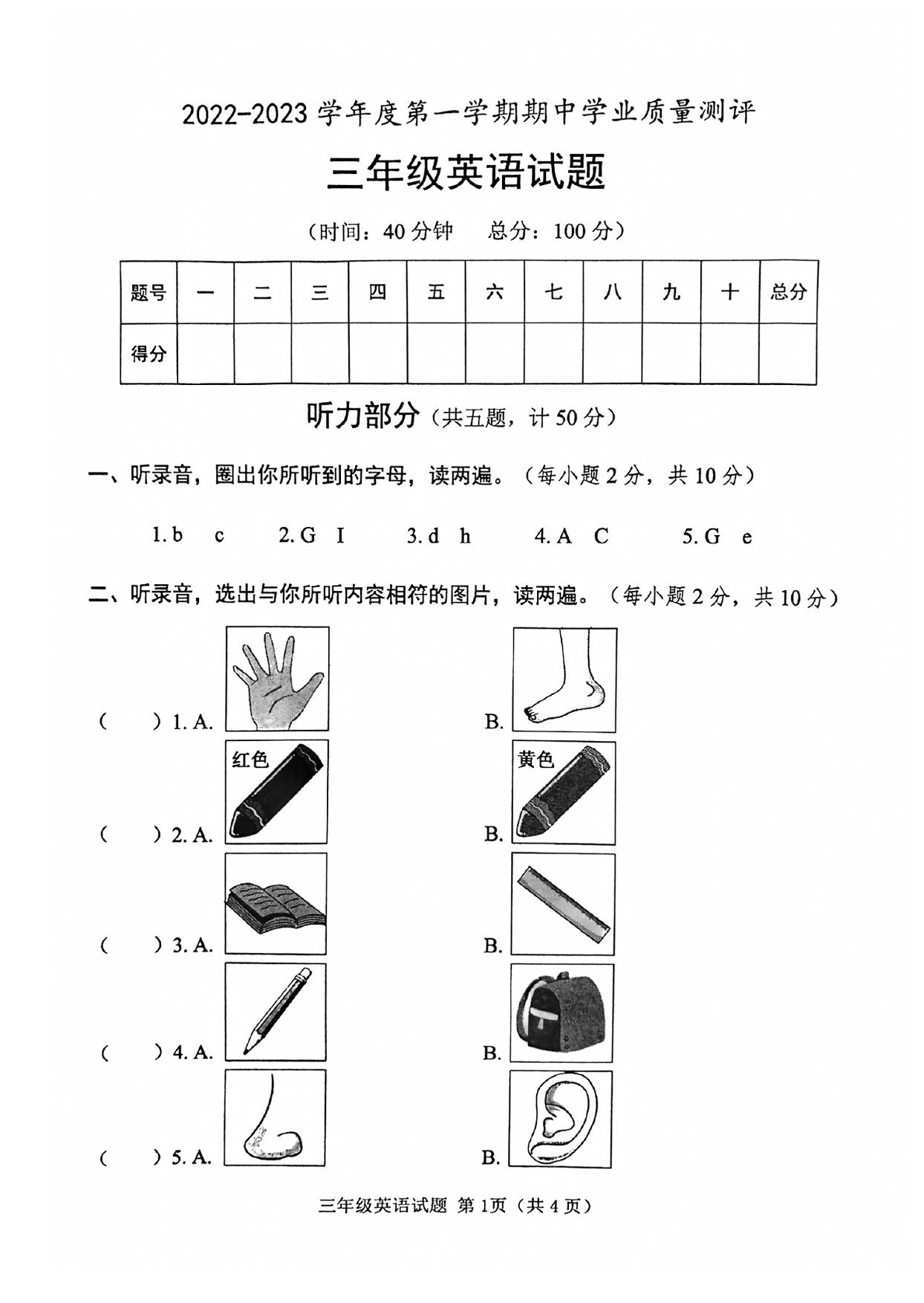 山东省菏泽市成武县2022-2023学年度第一学期期中学业质量测评试题三年级英语(人教PEP版)【无听力音频】