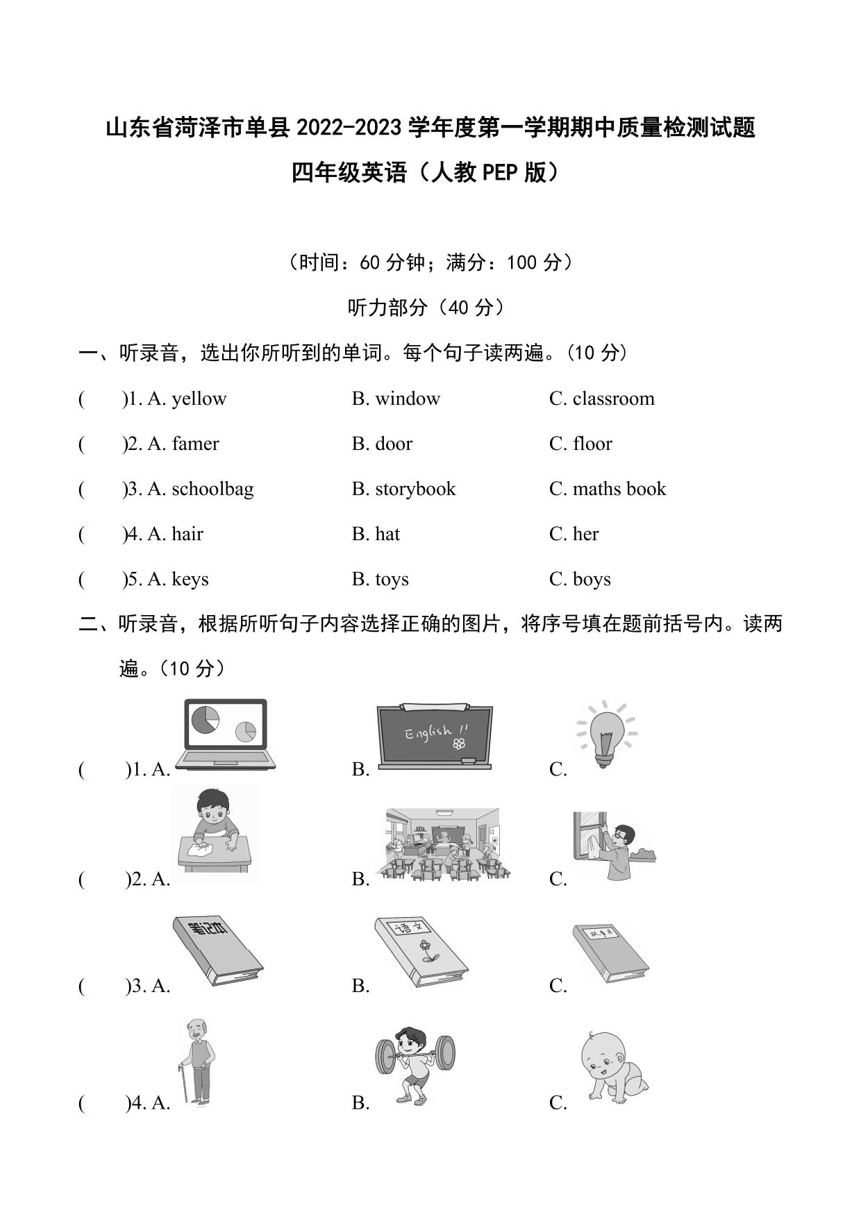 山东省菏泽市单县2022-2023学年度第一学期期中质量检测试题四年级英语(人教PEP版)【无听力音频】