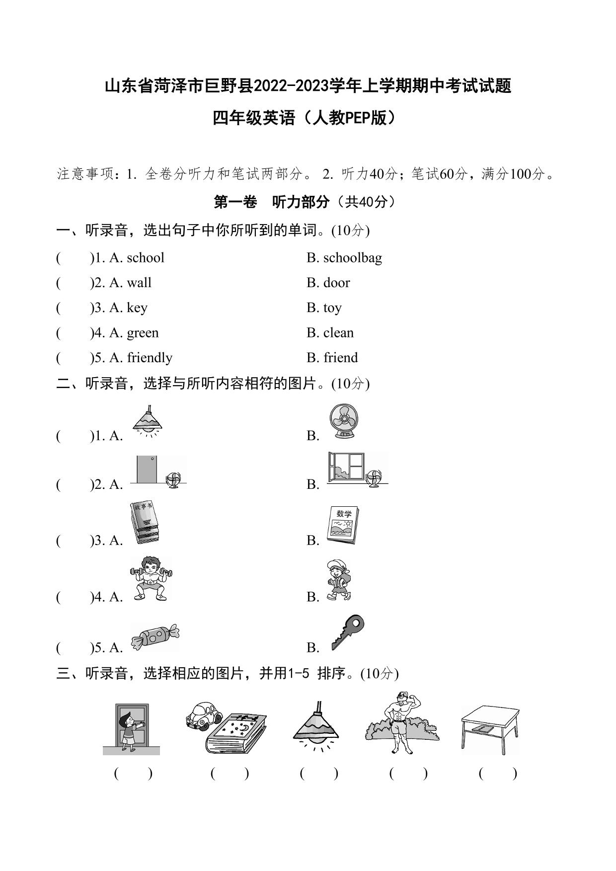 山东省菏泽市巨野县2022-2023学年上学期期中考试试题四年级英语(人教PEP版)【无听力音频】