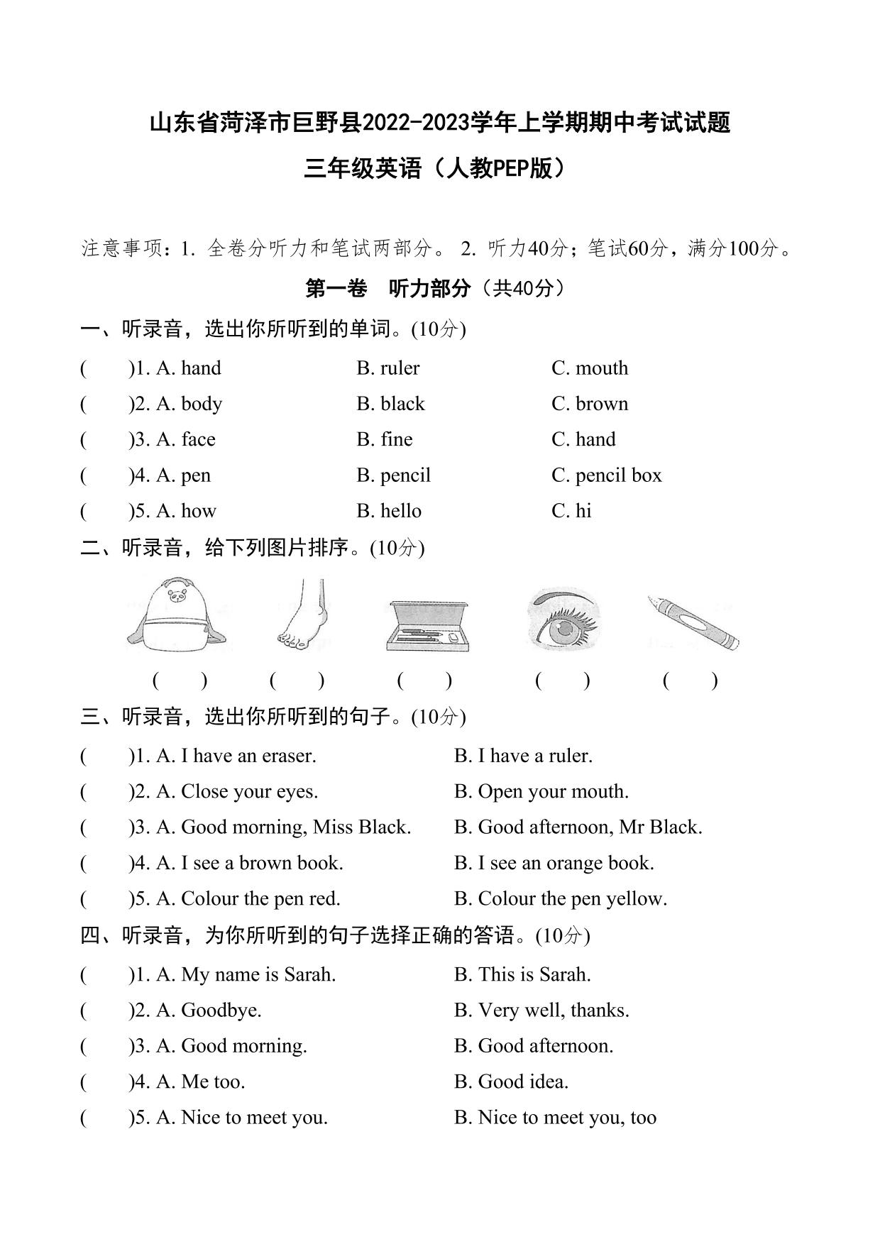 山东省菏泽市巨野县2022-2023学年上学期期中考试试题三年级英语(人教PEP版)【无听力音频】
