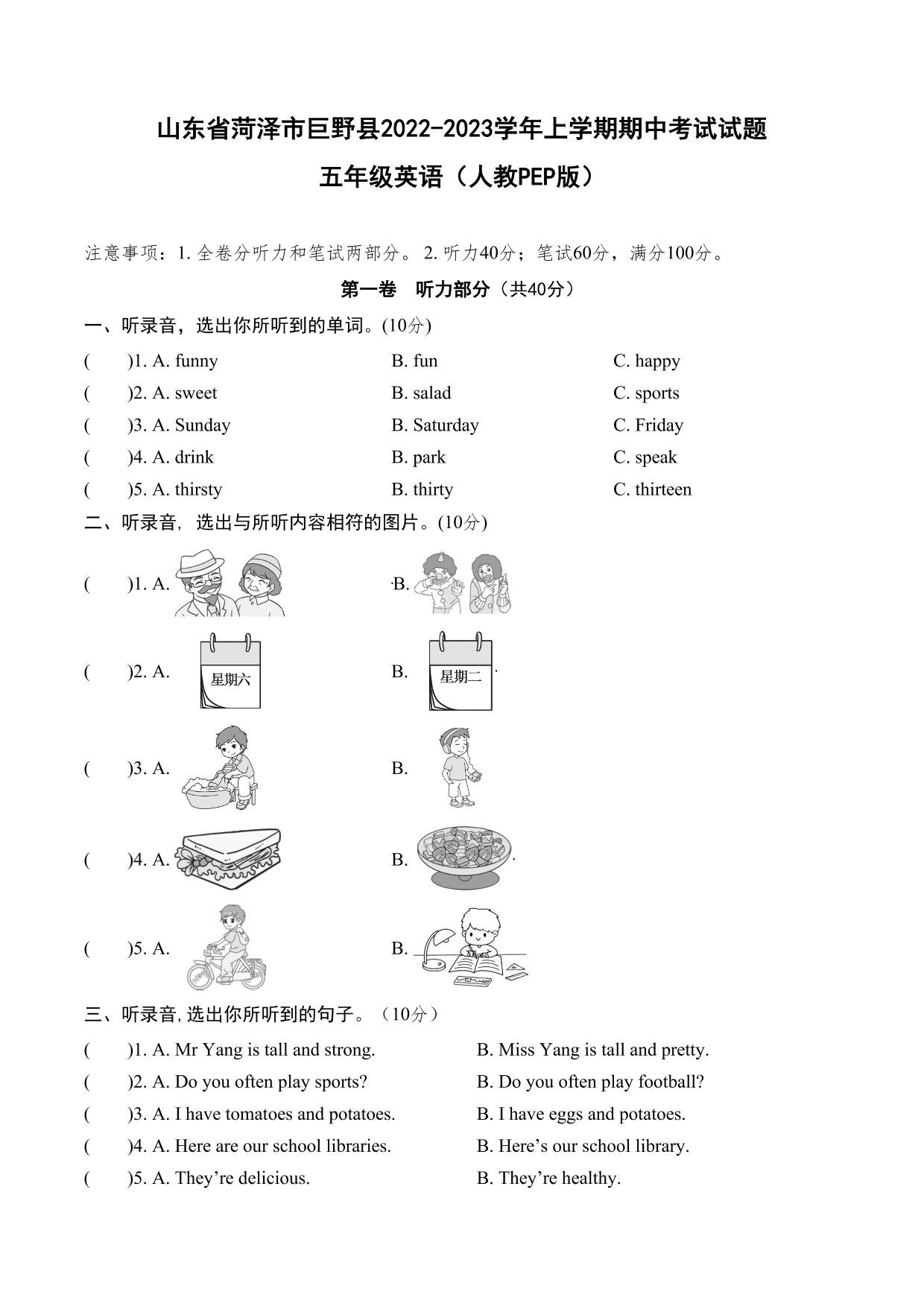山东省菏泽市巨野县2022-2023学年上学期期中考试试题五年级英语(人教PEP版)【无听力音频】