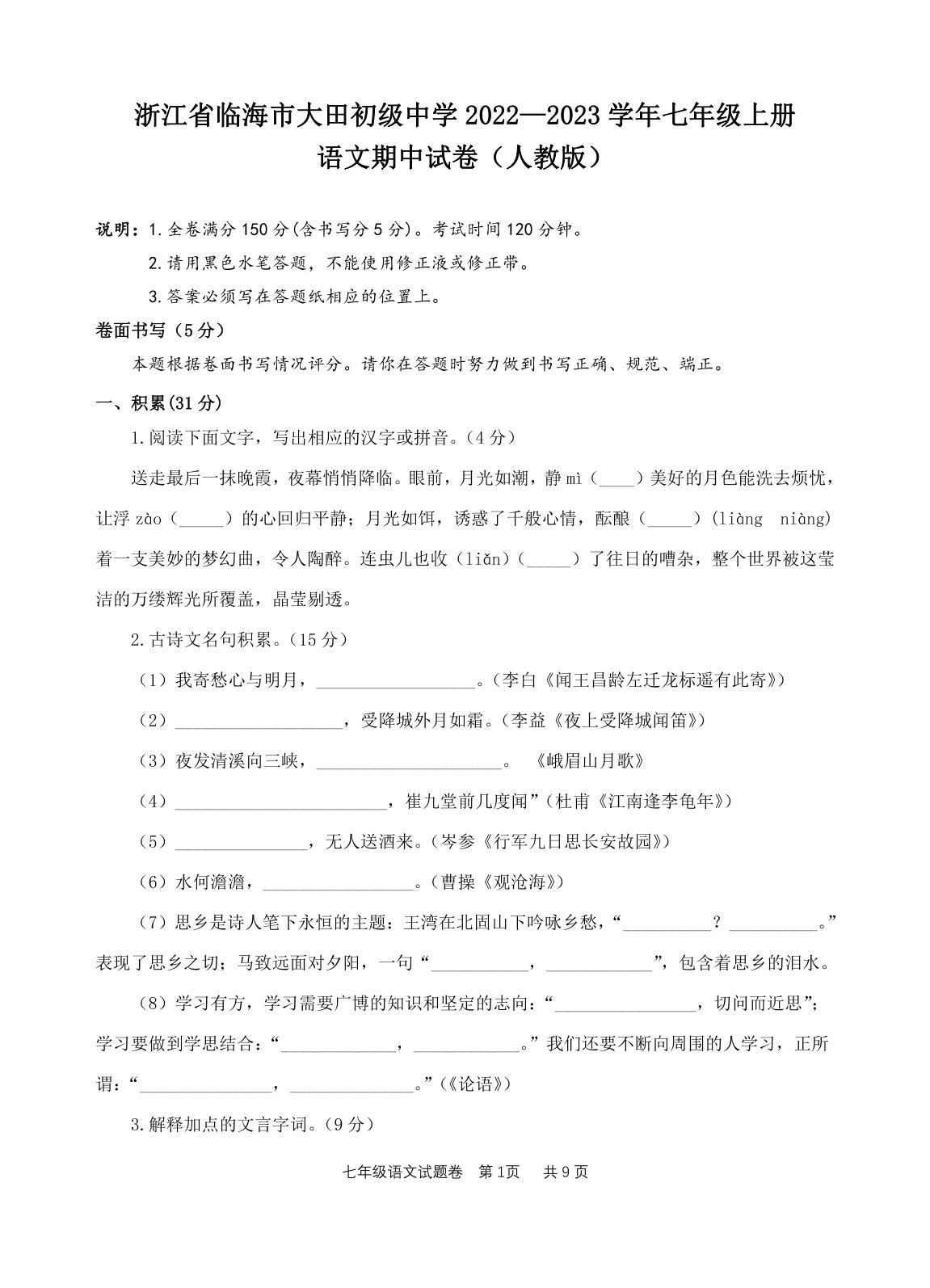 浙江省临海市大田初级中学2022学年七年级上册语文期中试卷(人教版)