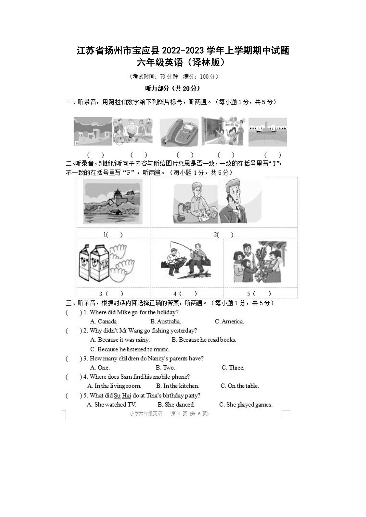 江苏省扬州市宝应县2022-2023学年上学期期中试题六年级英语(译林版)【无听力音频】