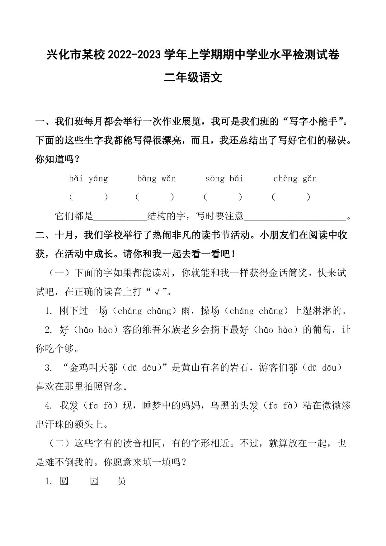 江苏省泰州市兴化市某校2022-2023学年上学期期中学业水平检测试卷二年级语文(人教版)