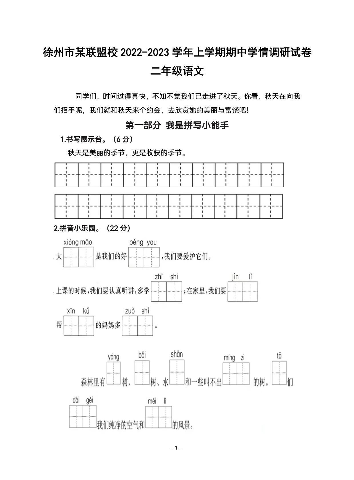 江苏省徐州市某联盟校2022-2023学年上学期期中学情调研试卷二年级语文(人教版)