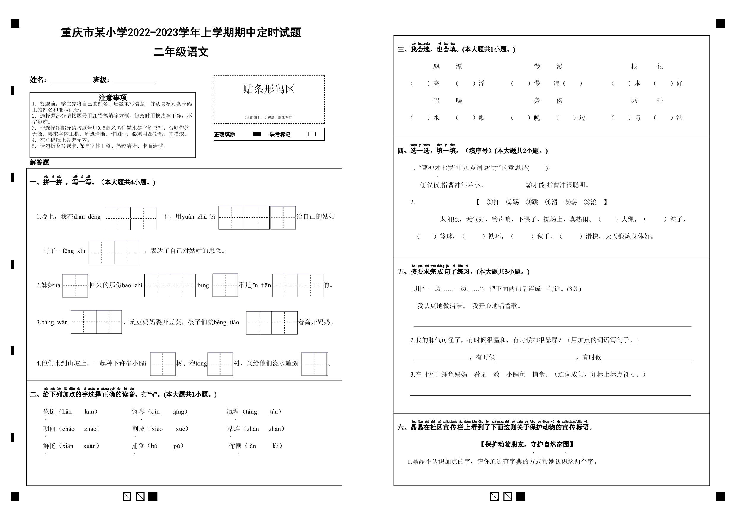 重庆市某小学2022-2023学年上学期期中定时试题二年级语文(人教版)
