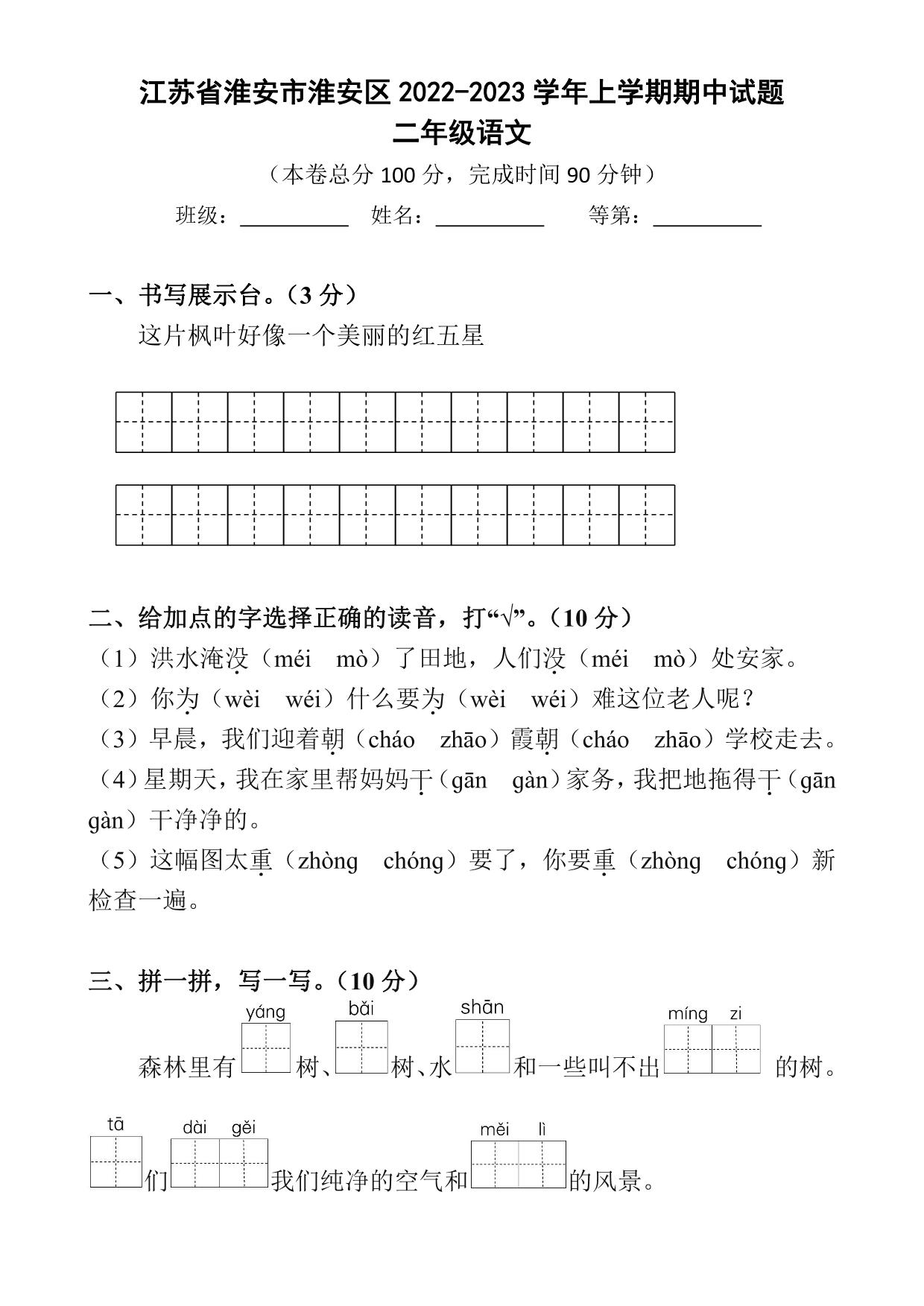 江苏省淮安市淮安区2022-2023学年上学期期中试题二年级语文(人教版)