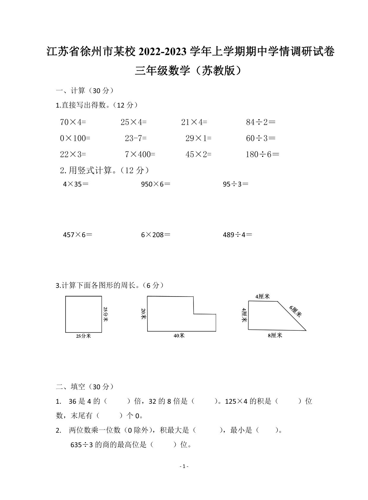 江苏省徐州市某校2022-2023学年上学期期中学情调研试卷三年级数学(苏教版)