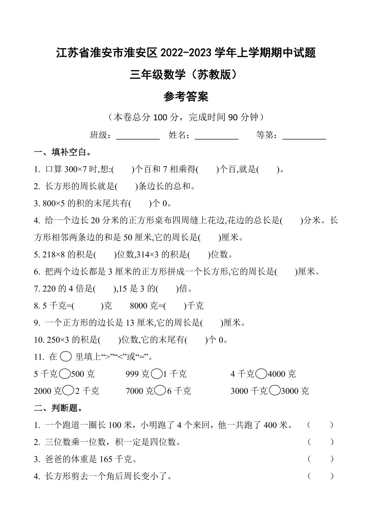 江苏省淮安市淮安区2022-2023学年上学期期中试题三年级数学(苏教版)