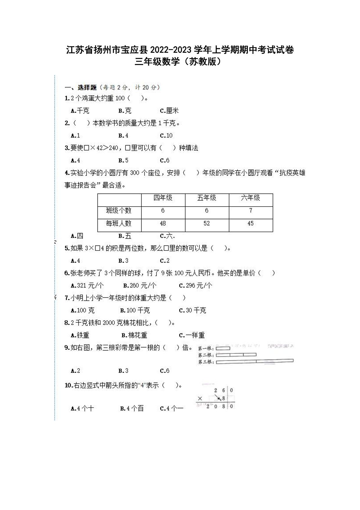 江苏省扬州市宝应县2022-2023学年上学期期中考试试卷三年级数学(苏教版)