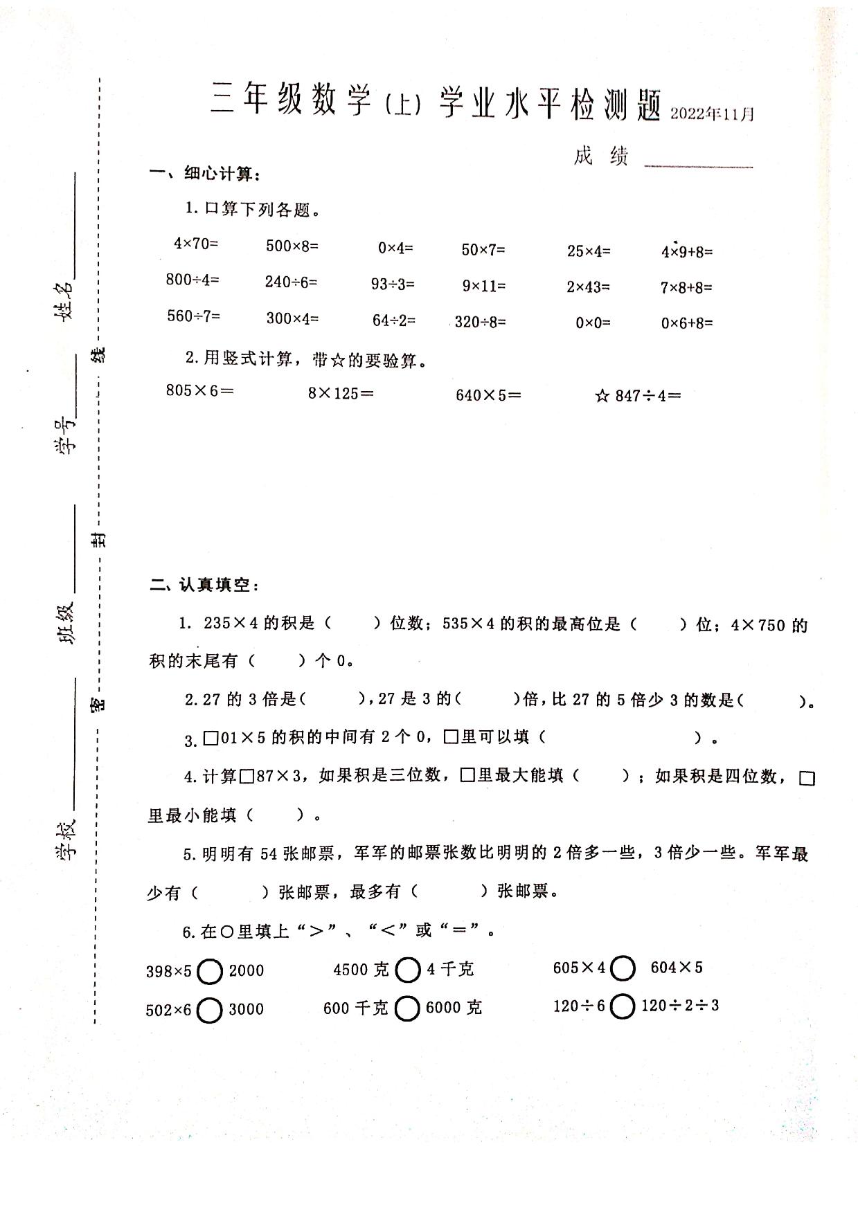 江苏省泰州市兴化市2022-2023学年上学期期中学业水平检测试题三年级数学(苏教版)