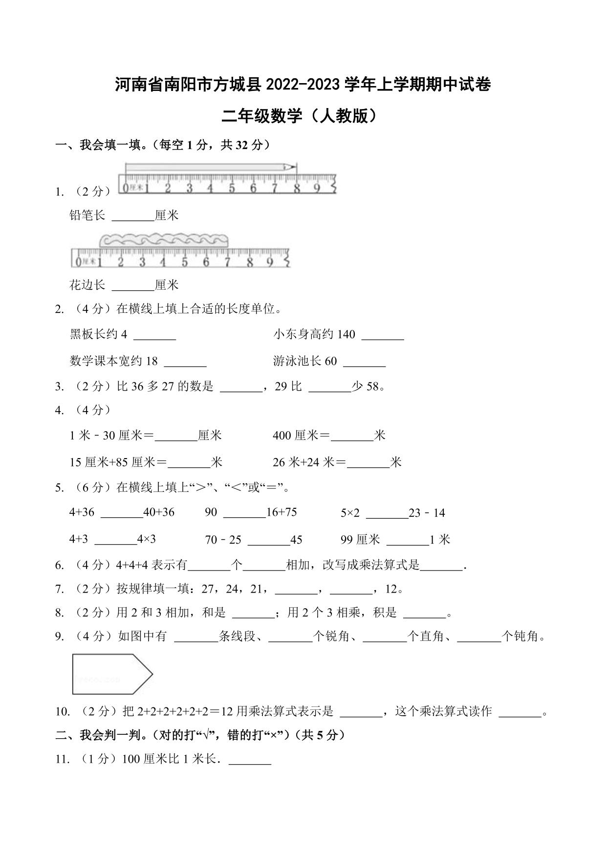 河南省南阳市方城县2022-2023学年上学期期中试卷二年级数学(人教版)