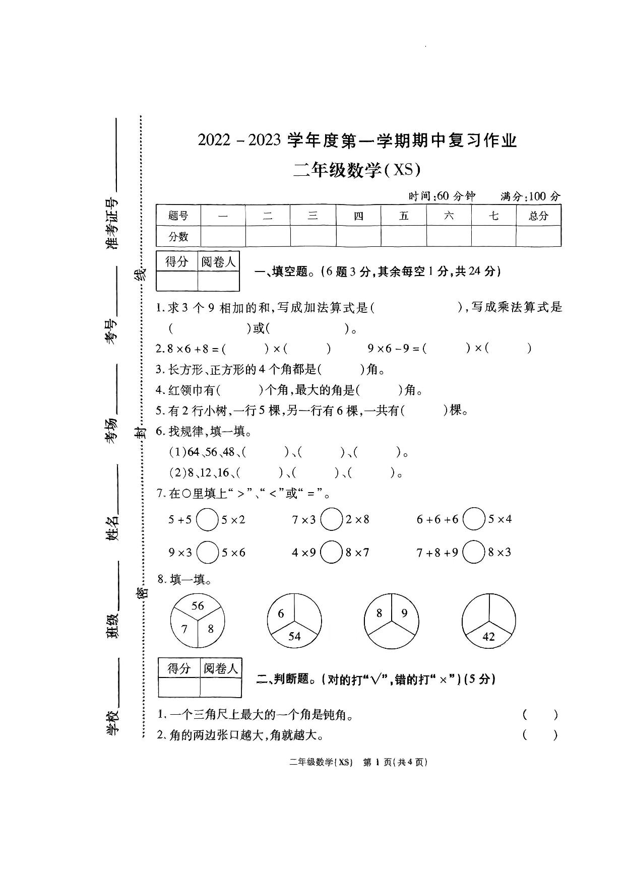 河南省周口市沈丘县某校2022-2023学年上学期期中试题二年级数学(西师版)