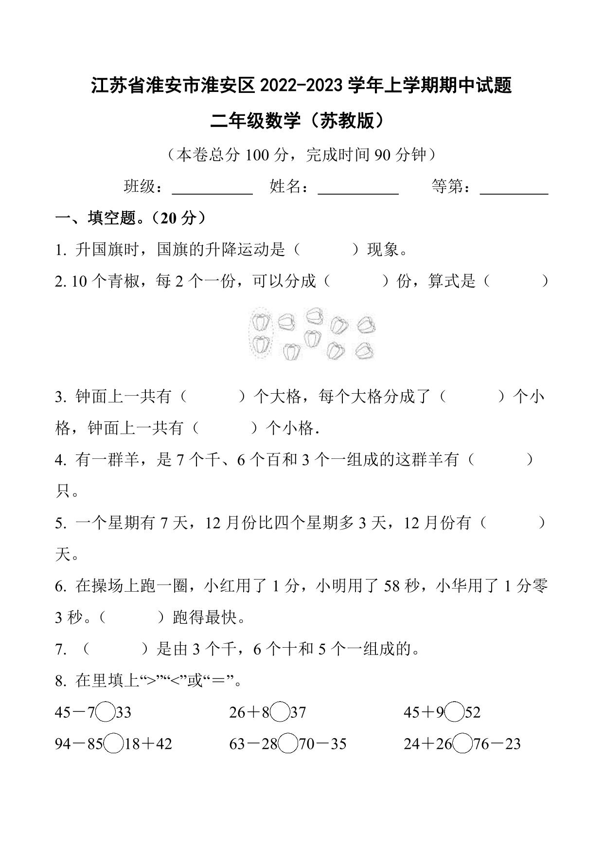 江苏省淮安市淮安区2022-2023学年上学期期中试题二年级数学(苏教版)