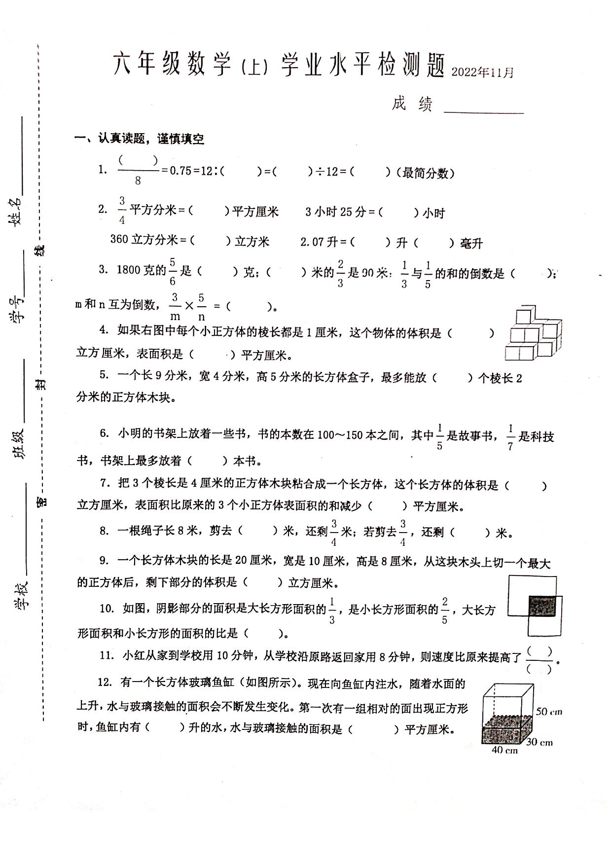 江苏省泰州市兴化市某校2022-2023学年第一学期期中试题六年级数学(苏教版)