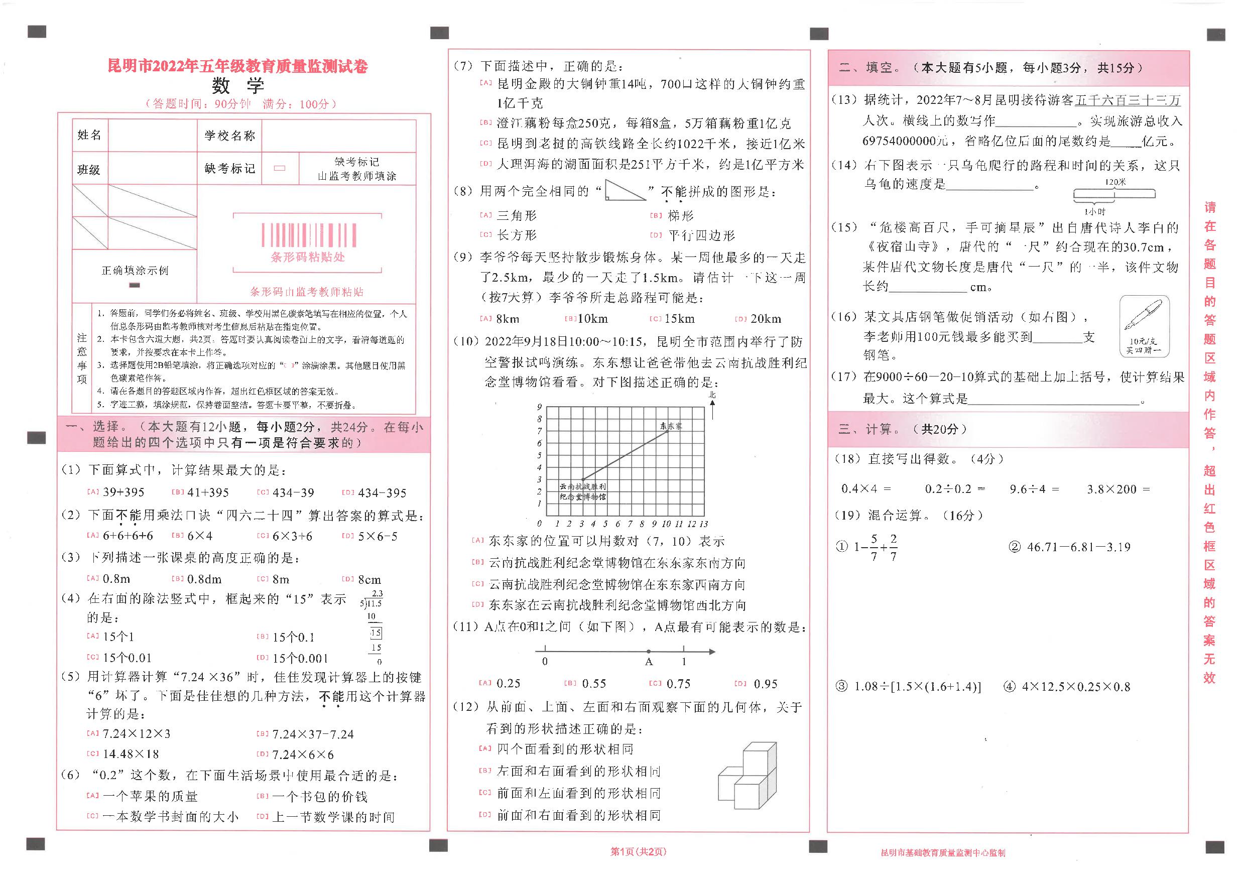 云南省昆明市2022-2023学年上学期期中试题五年级数学(人教版)