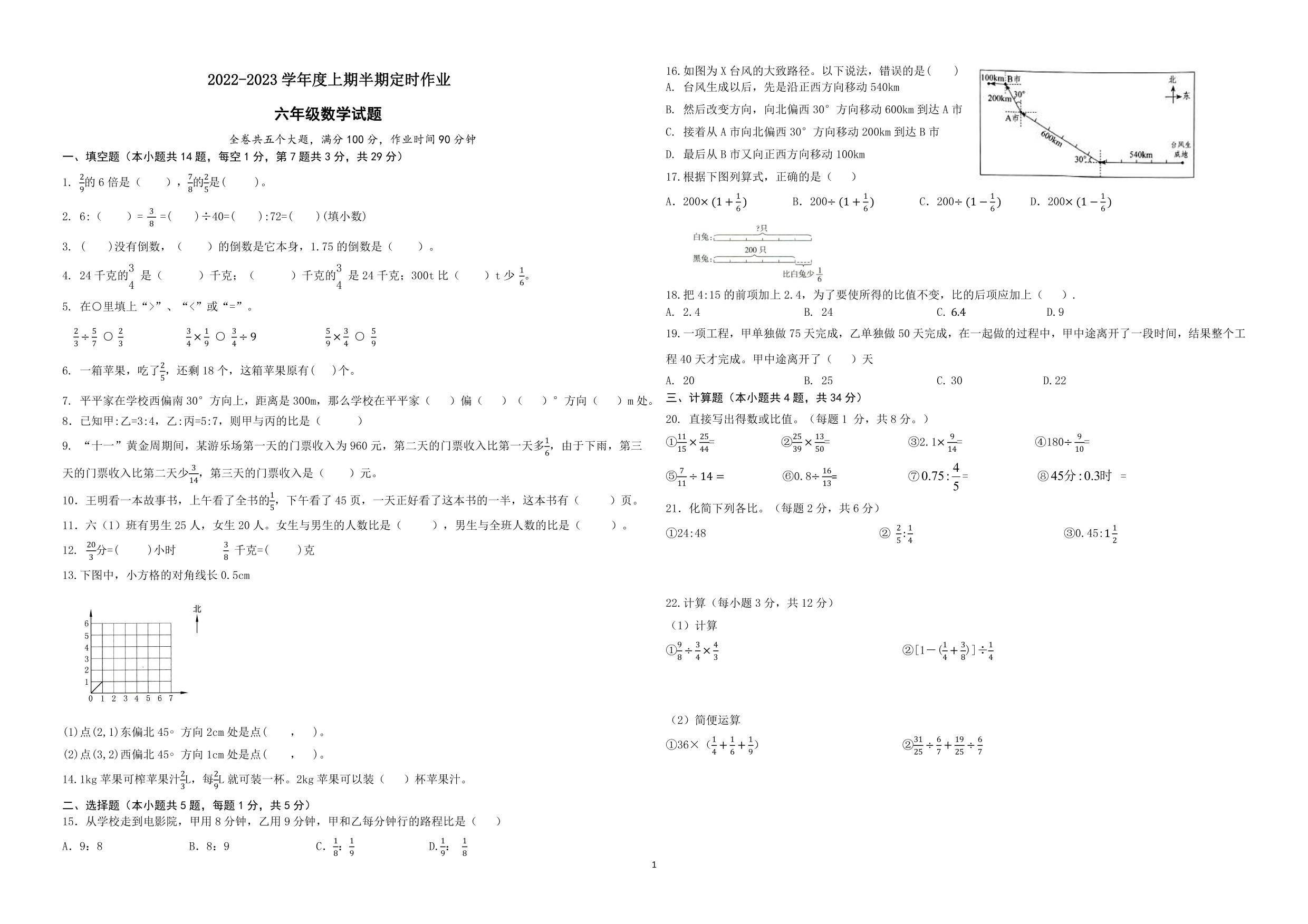 重庆市某学校2022-2023学年上学期期中定时作业六年级数学(人教版)