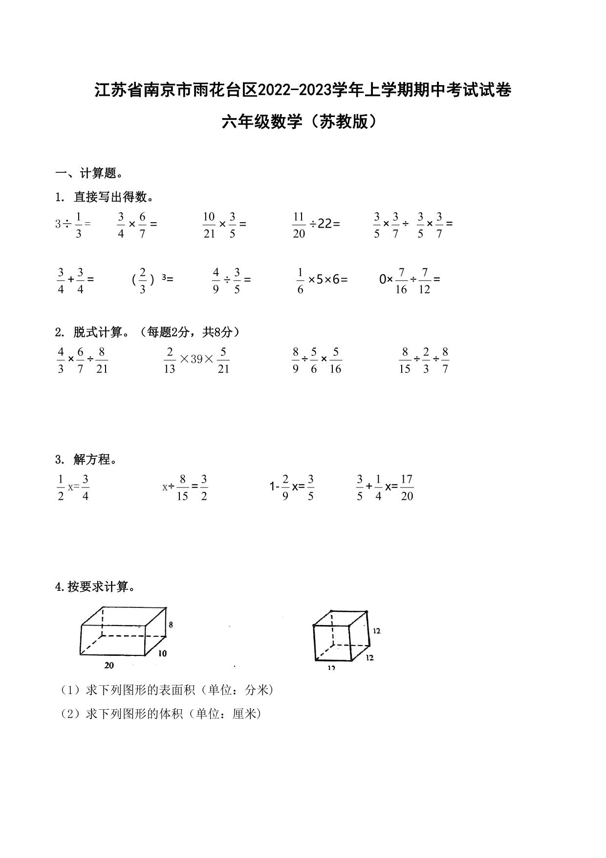 江苏省南京市雨花台区2022-2023学年上学期期中考试试卷六年级数学(苏教版)