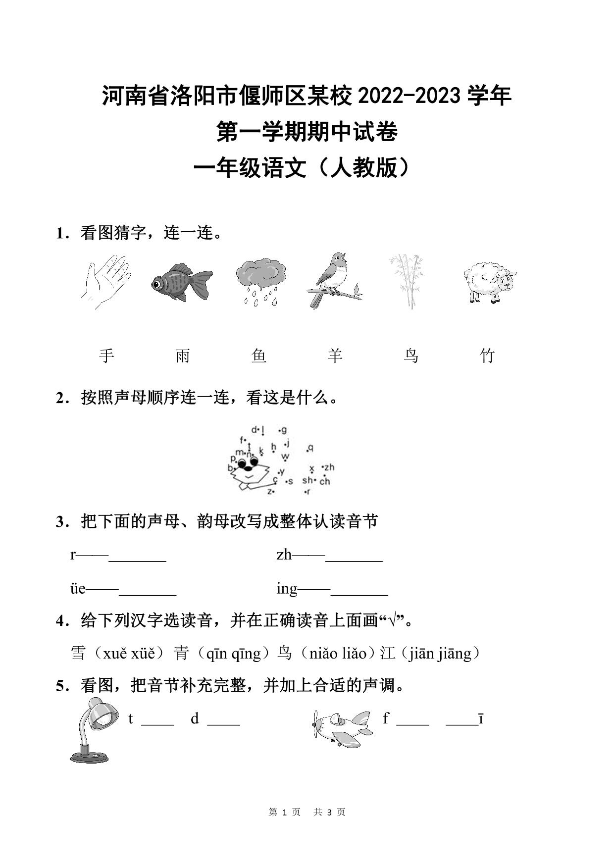 河南省洛阳市偃师区某校2022-2023学年第一学期期中试卷一年级语文(人教版)