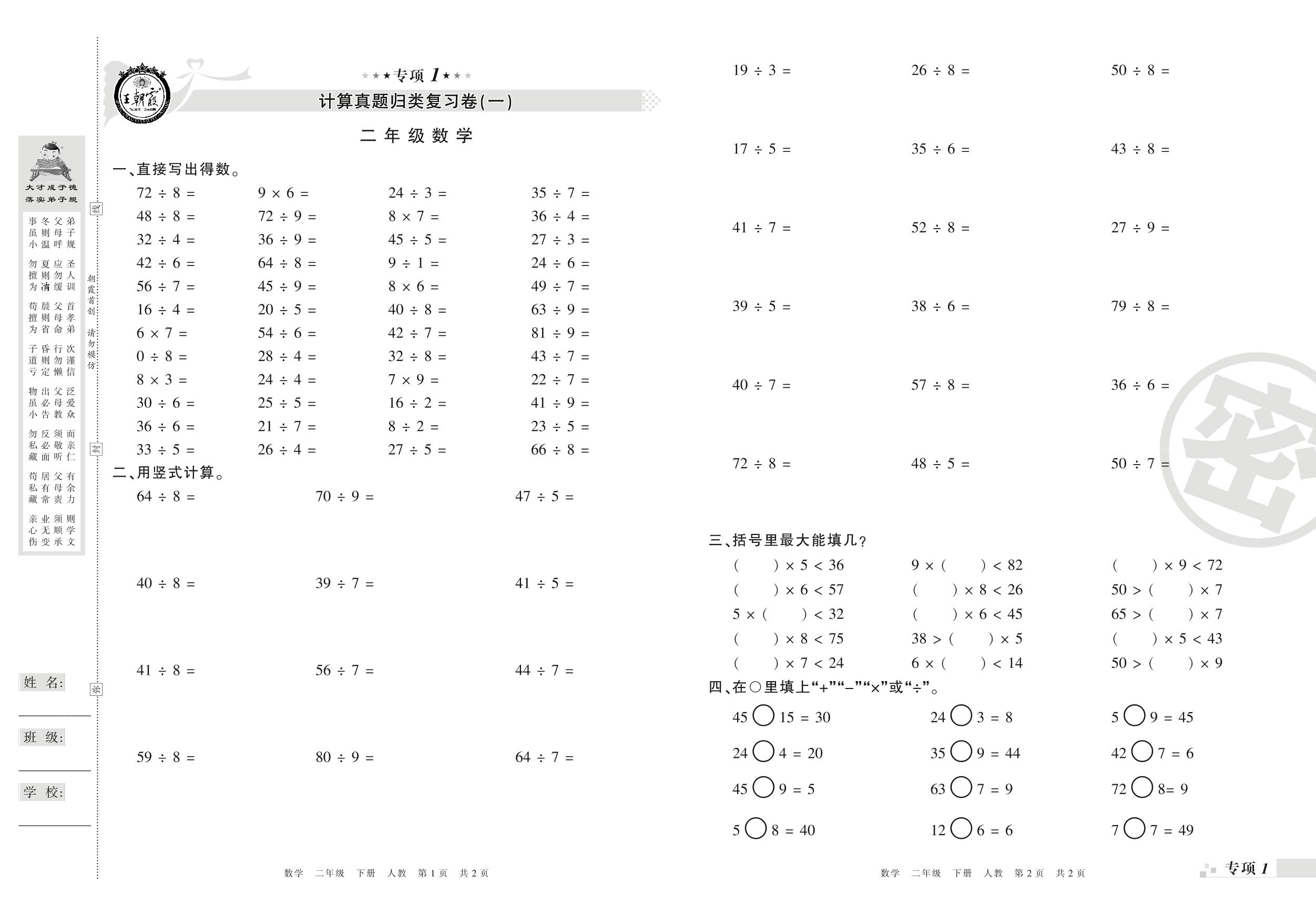 二年级数学人教版下册专项卷
