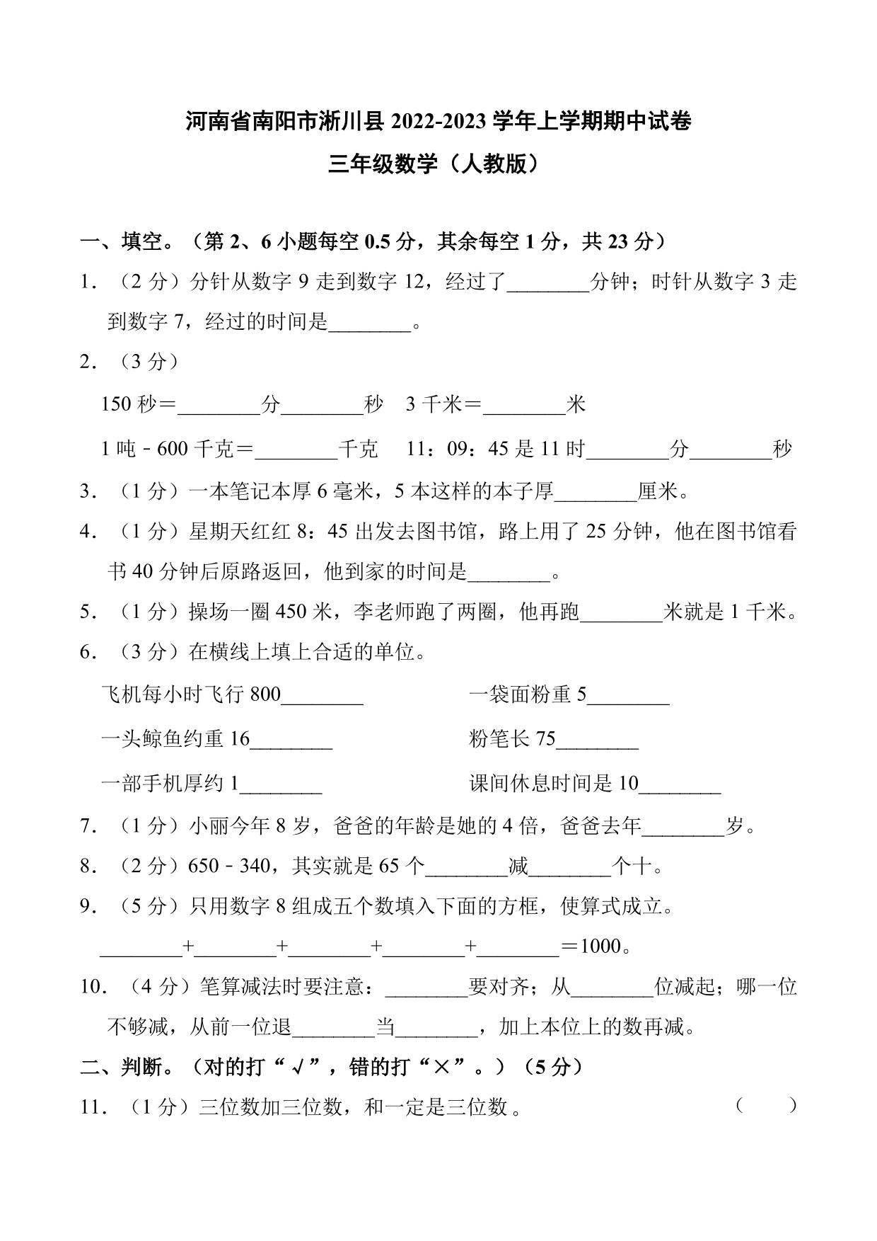河南省南阳市淅川县2022-2023学年上学期期中试卷三年级数学(人教版)
