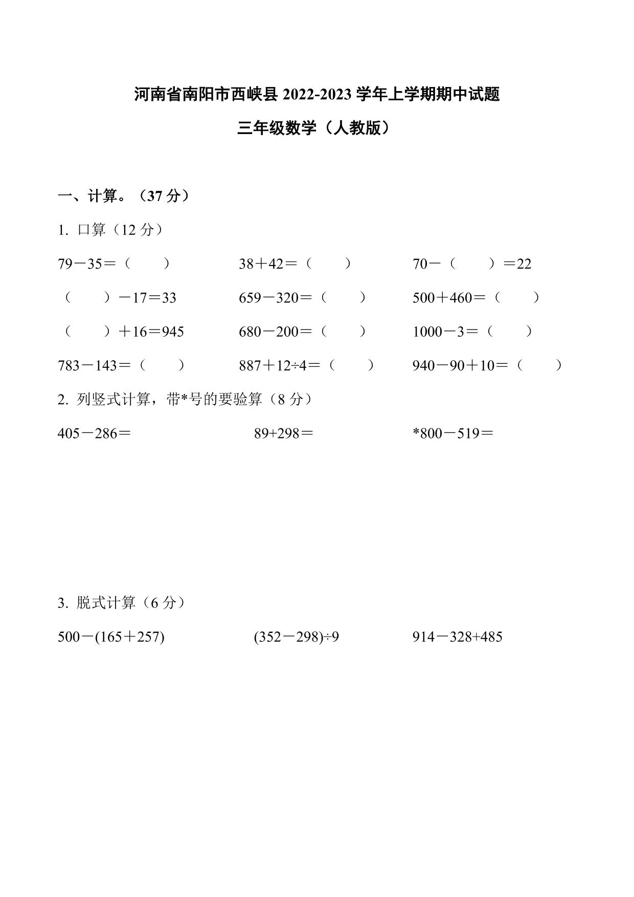 河南省南阳市西峡县2022-2023学年上学期期中试题三年级数学(人教版)