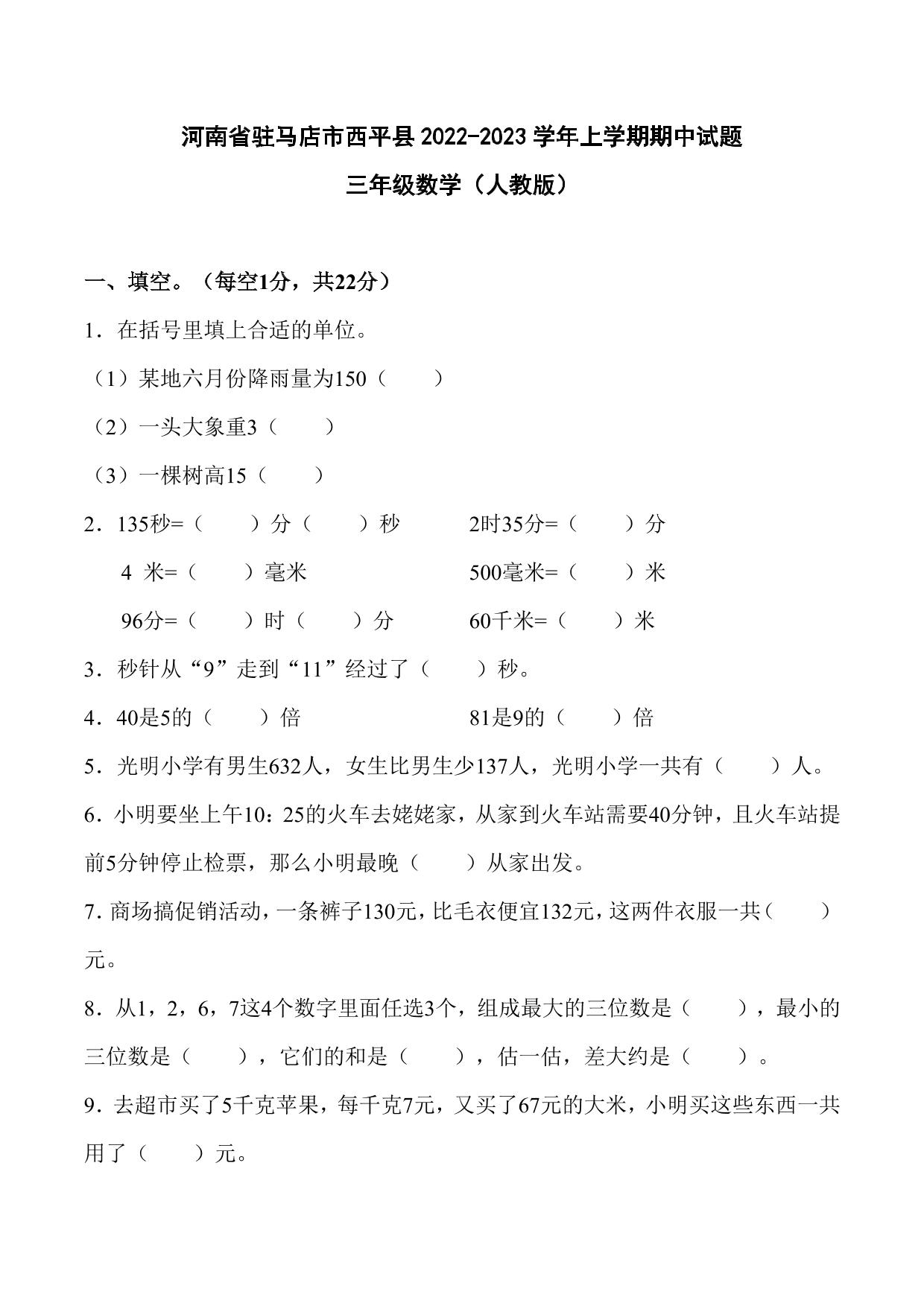 河南省驻马店市西平县2022-2023学年上学期期中试题三年级数学(人教版)