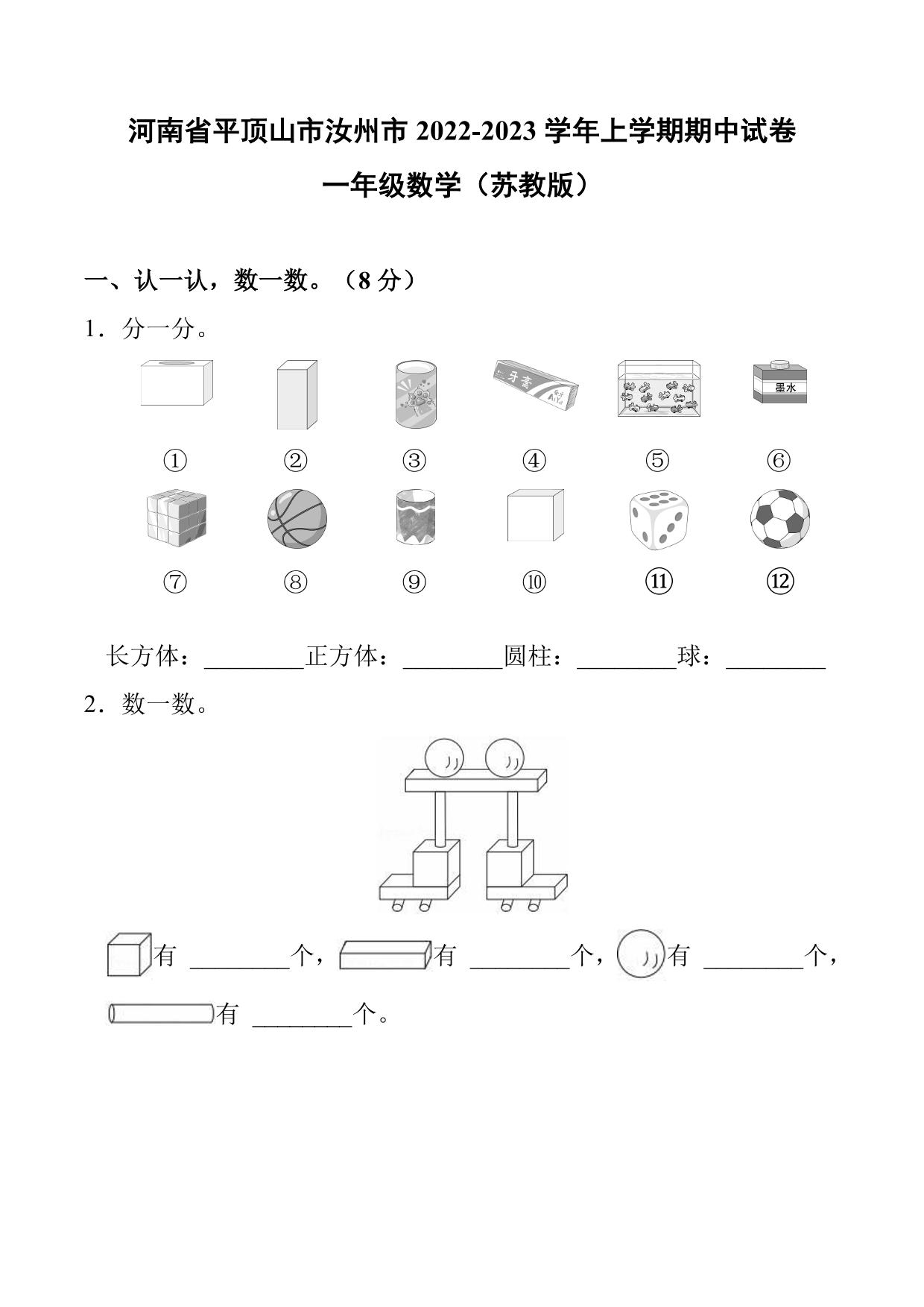 河南省平顶山市汝州市2022-2023学年上学期期中试卷一年级数学(苏教版)