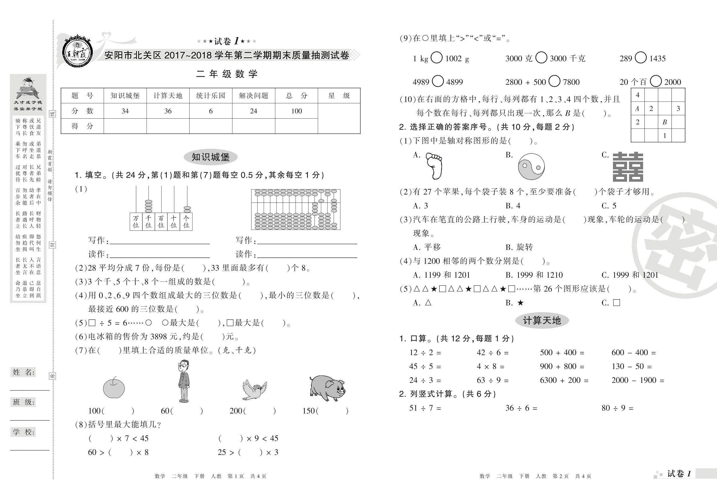 2017-2018学年第二学期安阳市北关区二年级数学试卷(人教版)【1】