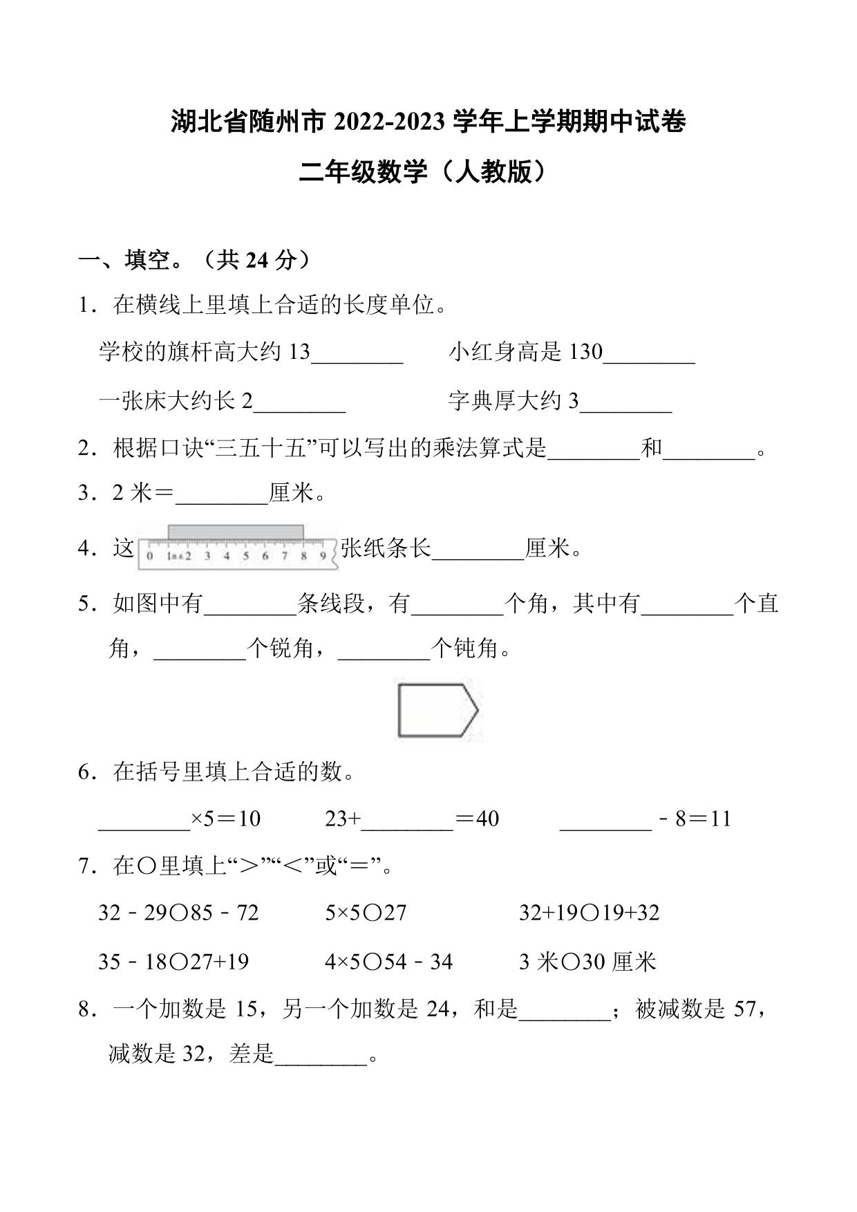 湖北省随州市2022-2023学年上学期期中试卷二年级数学(人教版)
