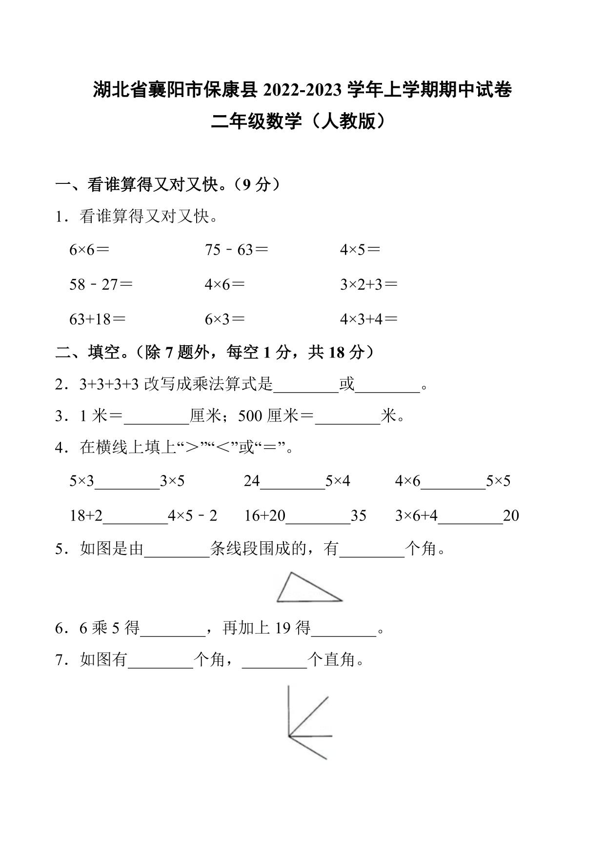 湖北省襄阳市保康县2022-2023学年上学期期中试卷二年级数学(人教版)