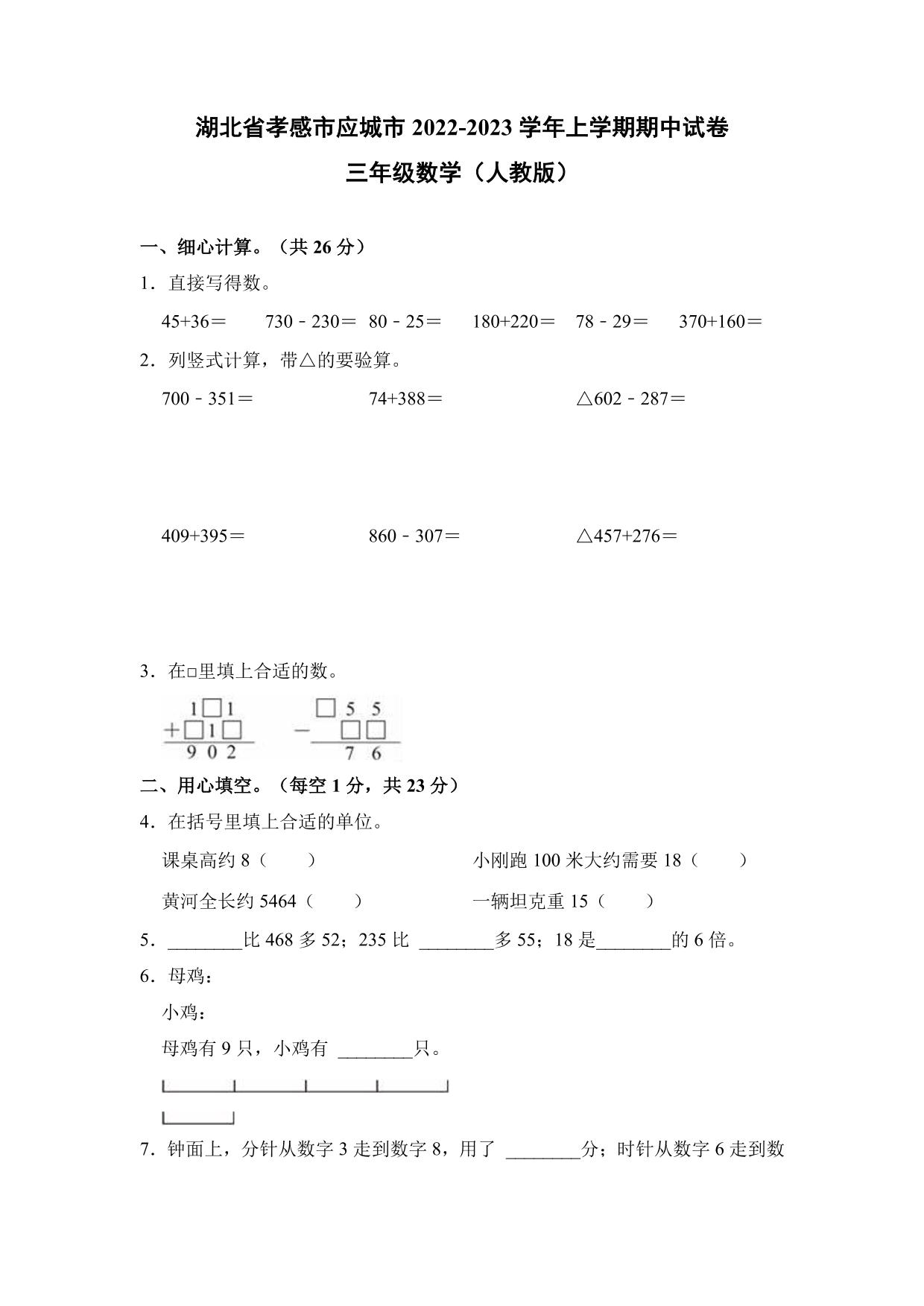 湖北省孝感市应城市2022-2023学年上学期期中试卷三年级数学(人教版)