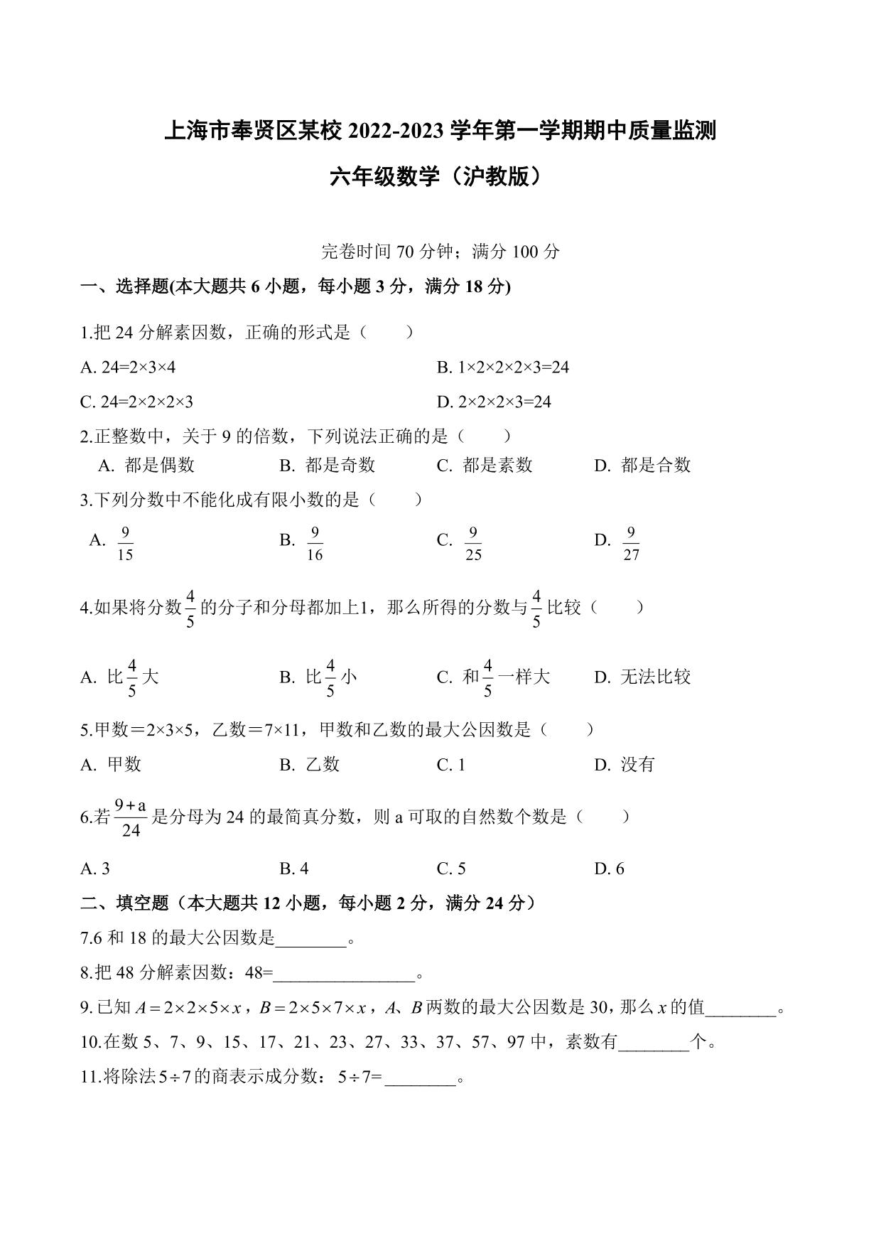 上海市奉贤区某校2022-2023学年第一学期期中质量监测六年级数学(沪教版)
