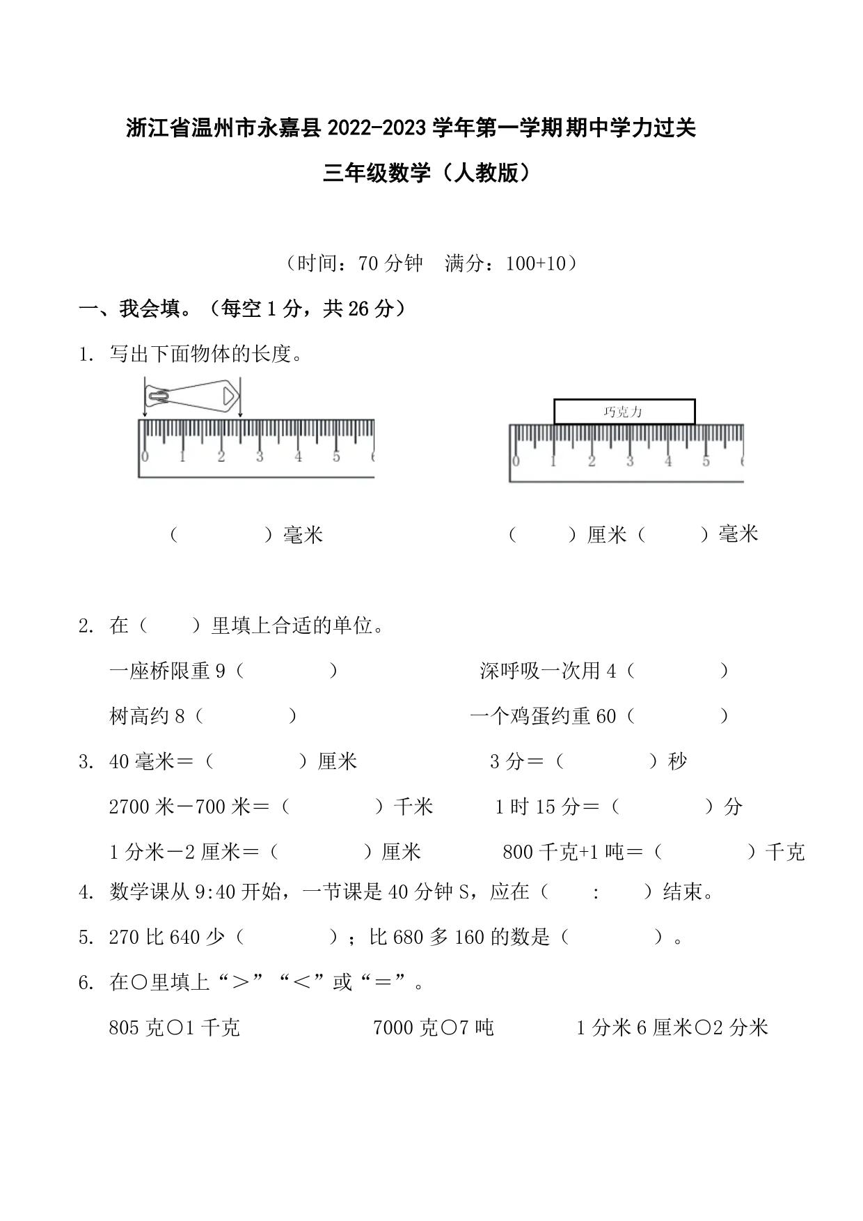 浙江省温州市永嘉县2022-2023学年第一学期期中学力过关三年级数学(人教版)