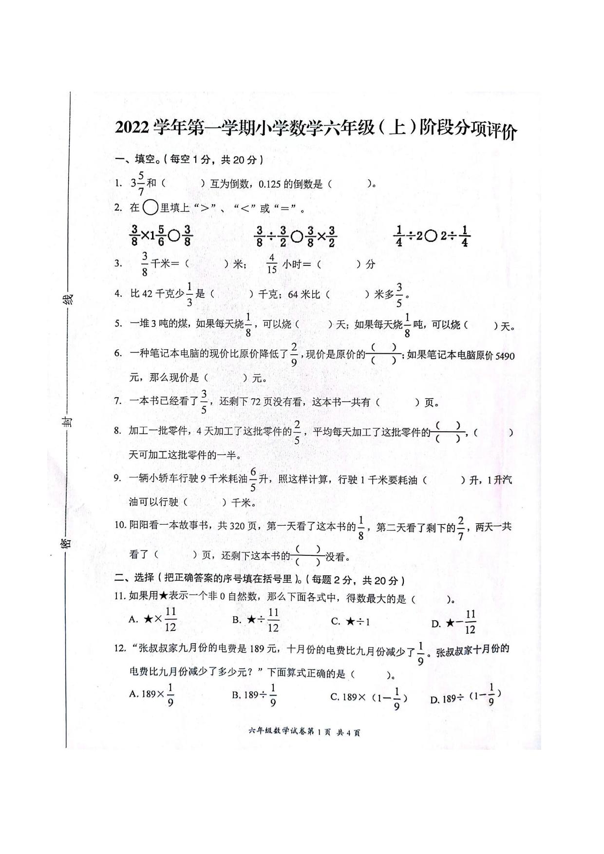 浙江省温州市瑞安市2022-2023学年第一学期小学数学六年级(上)阶段分项评价(人教版)