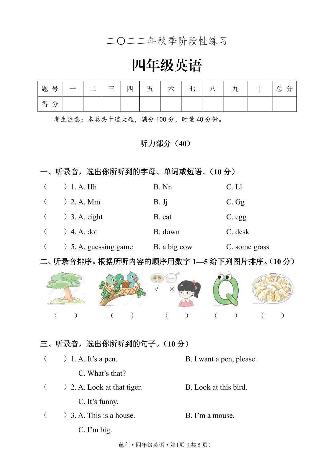 湖南省张家界市慈利县2022-2023学年四年级上学期期中教学质量检测英语试题(湘少版)【无听力音频】