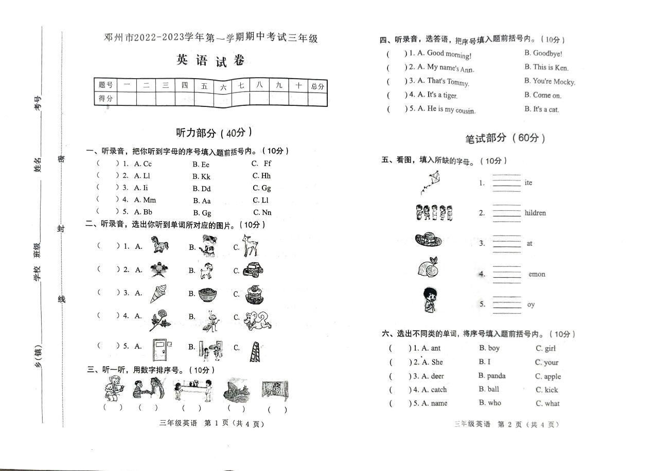 河南省南阳市邓州市2022-2023学年第一学期期中考试试卷三年级英语(北师版)【无听力音频】