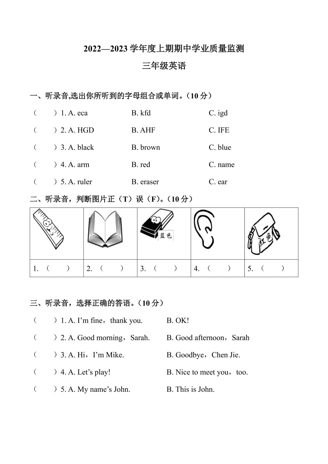 三年级英语人教PEP版(三起始)上册期中卷