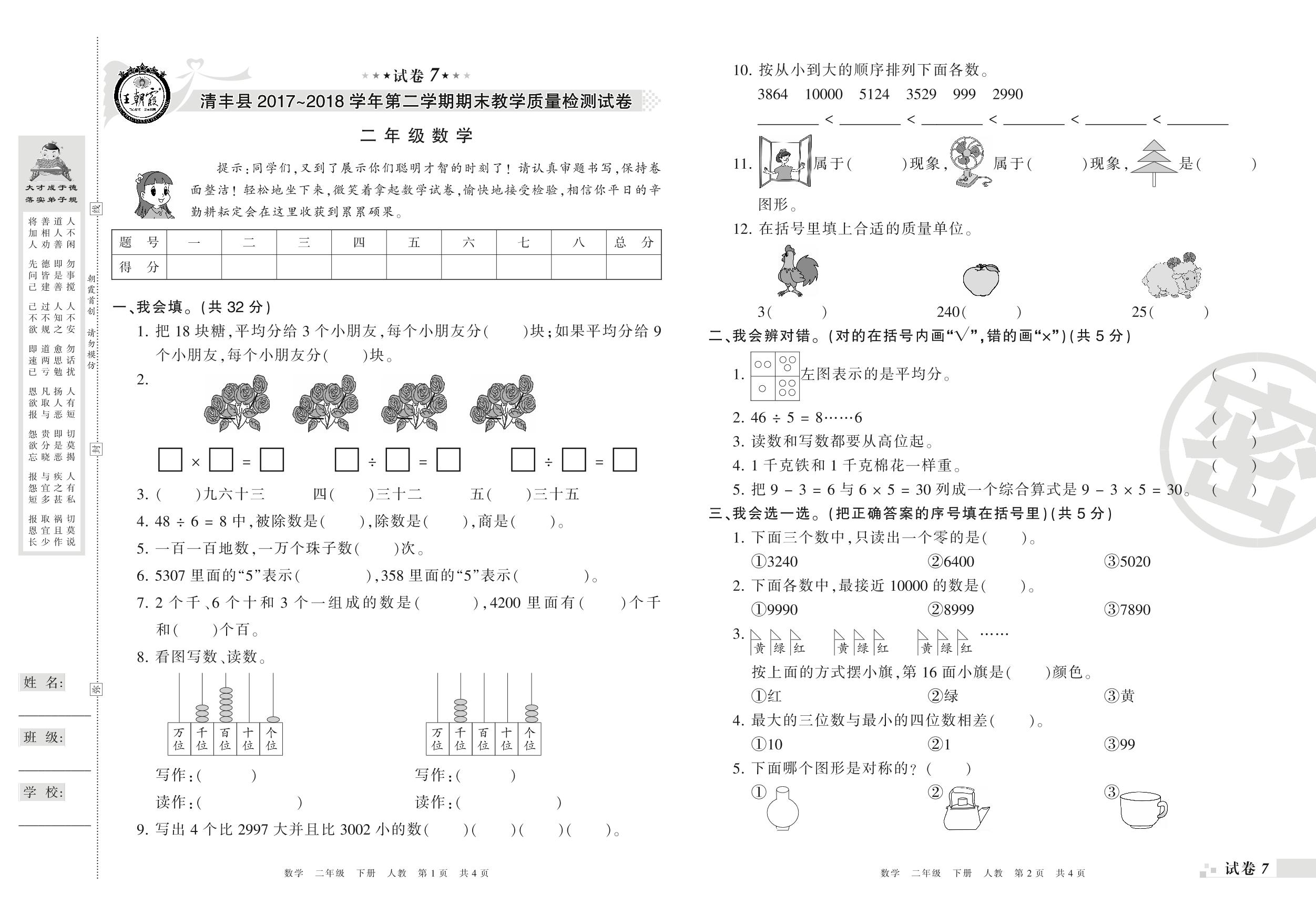 2017-2018学年第二学期濮阳市清丰县二年级数学试卷(人教版)【7】