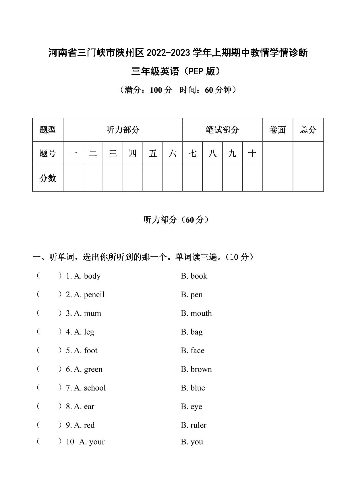河南省三门峡市陕州区2022-2023学年上册期中考试试卷三年级英语(PEP版)【无听力音频】